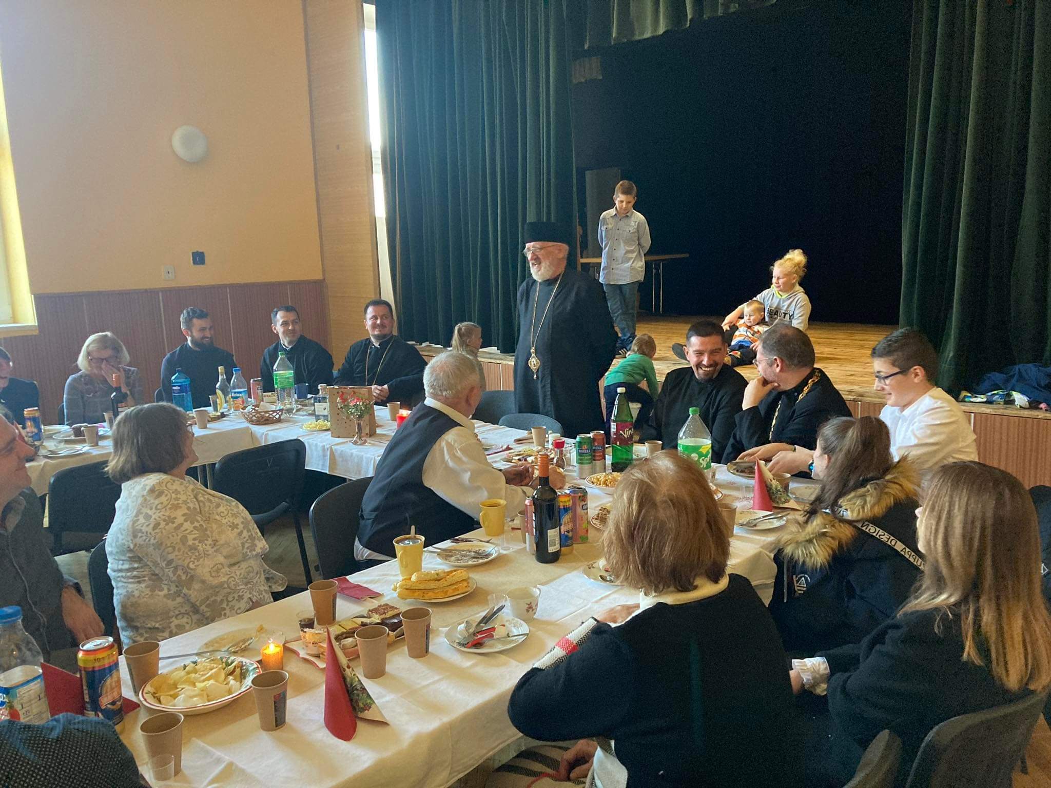 Po myrovaní a poďakovaní vladykovi sa farské spoločenstvo premiestnilo do blízkeho Katolíckeho domu, ktorý patrí miestnej Rímskokatolíckej cirkvi, a kde sa konal spoločný odpustový farský obed a pohostenie. Pozvanie k sviatočnému stolu prijal aj miestny rímskokatolícky dekan vdp. Stanislav Culka s kaplánom, ktorému sme vďační, že nám zakaždým ústretovo poskytuje tieto priestory na odpustový obed.