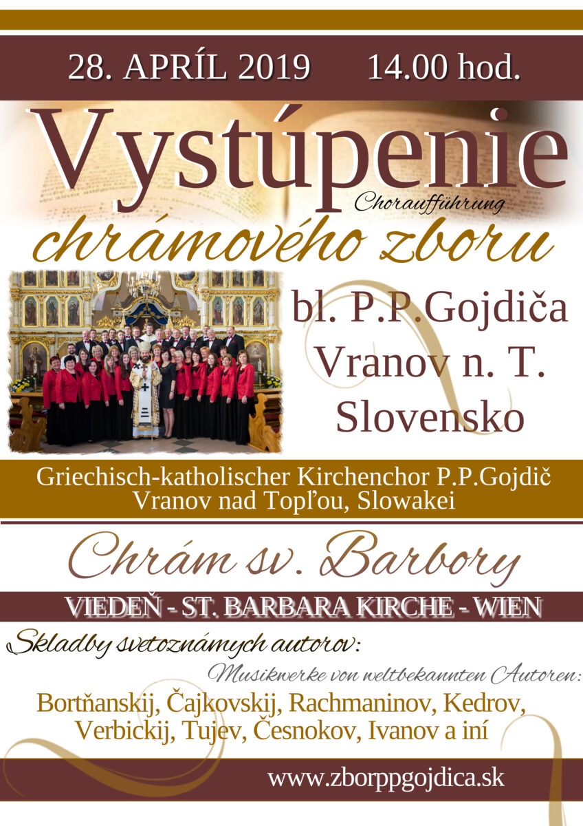 Gréckokatolícka misia v Rakúsku a Gréckokatolícky chrámový zbor bl. P. P. Gojdiča z Vranova n. T. – Čemerného pozývajú na sv. liturgiu  v nedeľu 28. apríla o 14:00 h. do gréckokatolíckeho chrámu Barbarakirche na Postgasse 8-12 vo Viedni. Zbor bude svojím spevom sprevádzať slávenie sv. liturgie.