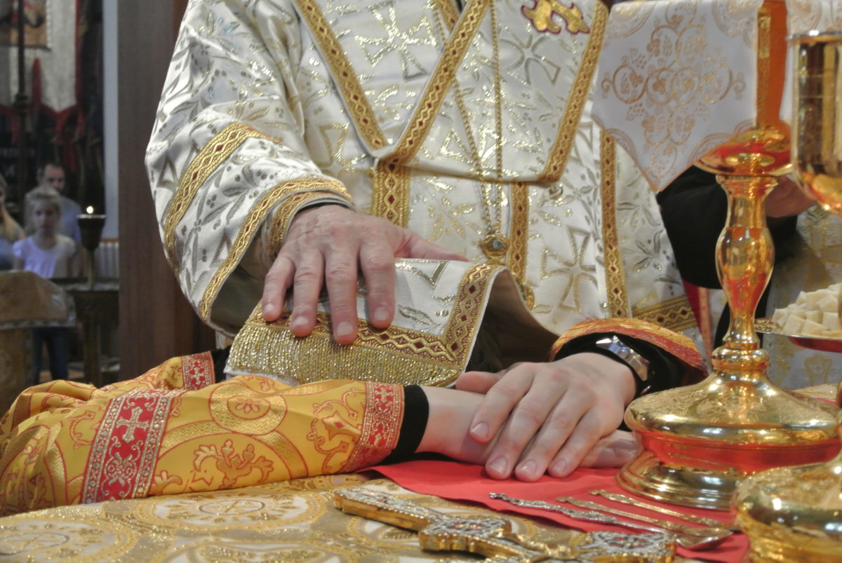 Nasledovala podstatná časť diakonskej vysviacky. Tá sa odohráva pri prestole, pred ktorým si svätenec kľaká na pravé koleno, položí naň ruky v tvare kríža a opiera sa hlavou o prestol. Svätiteľ položil na hlavu svätenca omofor, trikrát ho požehnal na hlave a nahlas prednášal slová konsekračnej modlitby: Božská milosť, ktorá vždy nemohúcich uzdravuje a nedostatočných naplňuje, ustanovuje zbožného poddiakona Andreja za diakona, pomodlime sa zaňho, nech naň zostúpi milosť presvätého Ducha“. Liturgické zhromaždenie následne odpovedalo trojitým Hospodi pomiluj.