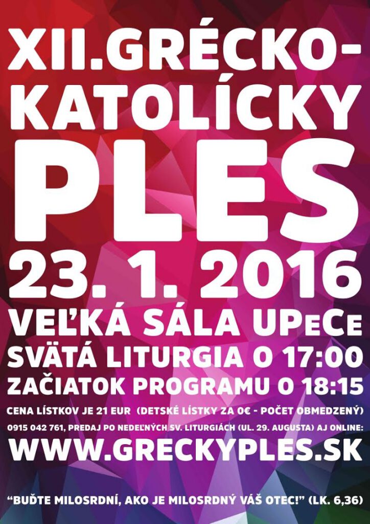Gréckokatolícka farnosť Bratislava- Staré Mesto pozýva na tradičný XII. Gréckokatolícky ples, ktorý sa bude konať v sobotu, 23. januára v Univerzitnom pastoračnom centre sv. Jozefa