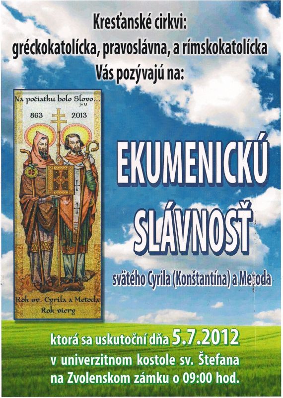 Gréckokatolícka cirkev, Pravoslávna cirkev a Rímskokatolícka cirkev pozývajú na Ekumenickú slávnosť do Zvolena, ktorá sa uskutoční 5. júla 2012 v univerzitnom kostole sv. Štefana na