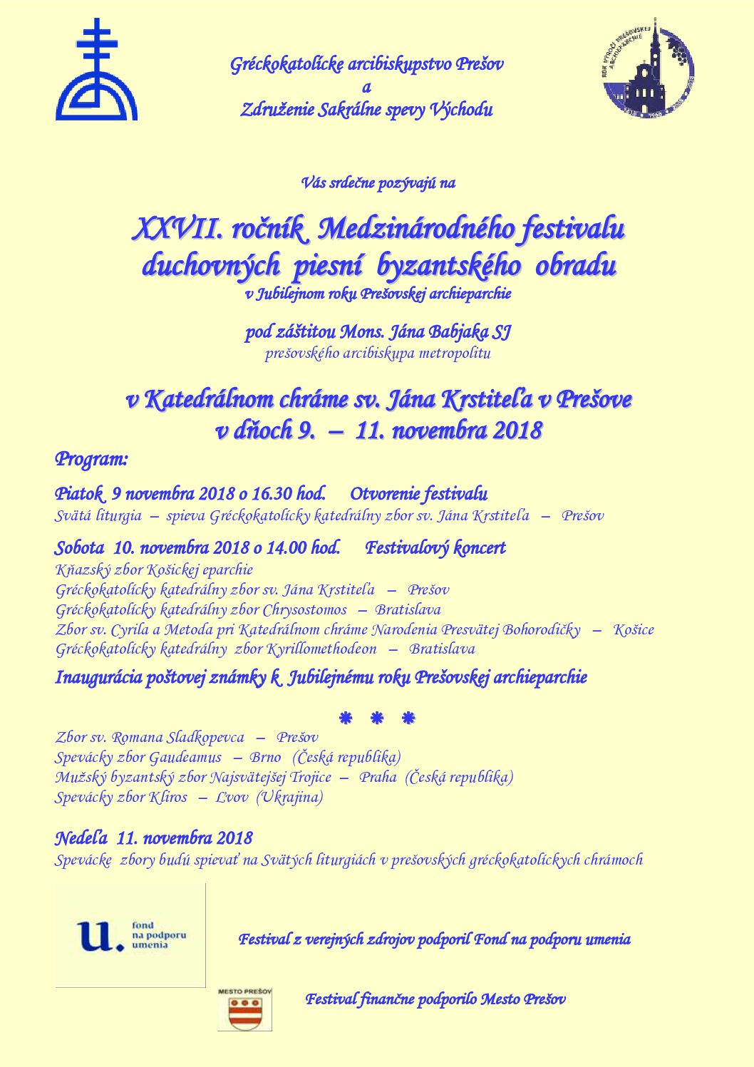 Združenie Sakrálne spevy Východu pozýva na XXVII.ročník Medzinárodného festivalu duchovných piesní byzantského obradu, ktorý sa uskutoční v prešovskom Gréckokatolíckom katedrálnom chráme sv. Jána Krstiteľa v