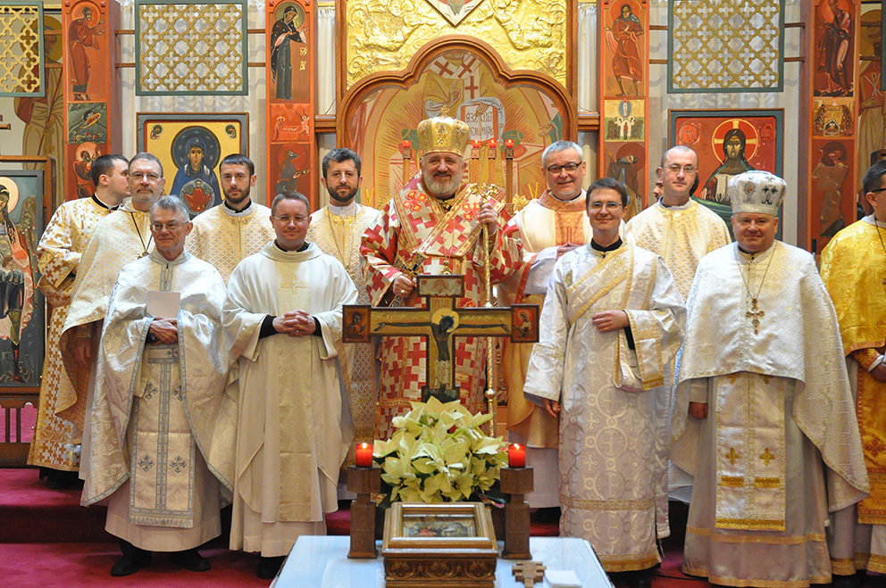 dsc_0188-V piatok 20. februára 2015 vladyka Peter Rusnák, ordinár Bratislavskej eparchie počas archijerejskej božskej liturgie v Sobore sv. Vladimíra Veľkého v Paríži (Eparchia sv. Vladimíra Ukrajinskej gréckokatolíckej cirkvi) rukopoložil na diakona Bohdana Jacoša, pôvodom zo Slovenska, ktorý v tomto roku zakončí svoje bohoslovecké štúdiá na Parížskom katolíckom inštitúte. Slávnostnú liturgiu v cirkevnej slovančine sprevádzal spevom katedrálny zbor Chrysostomos pod vedením Martina Škovieru.