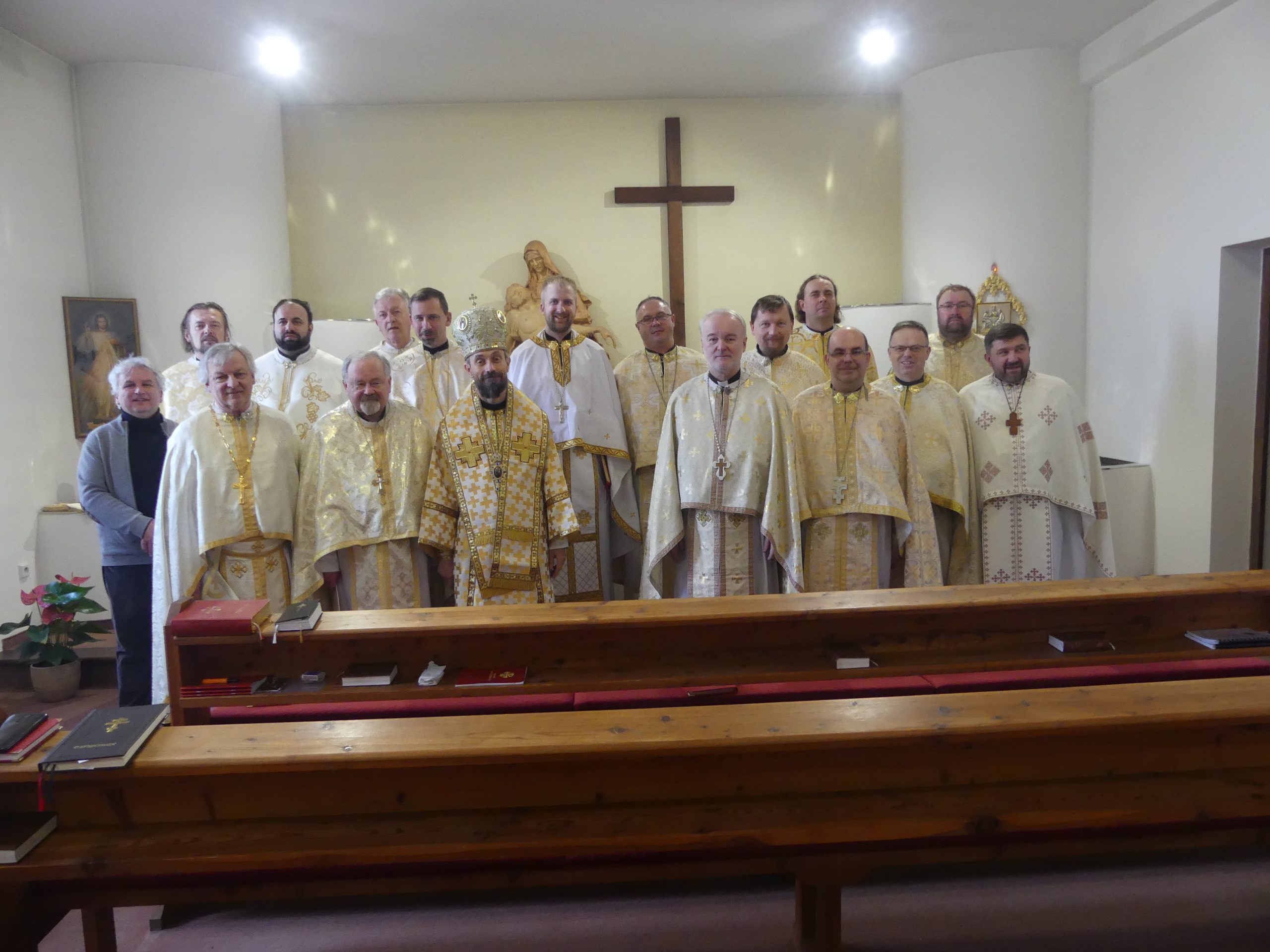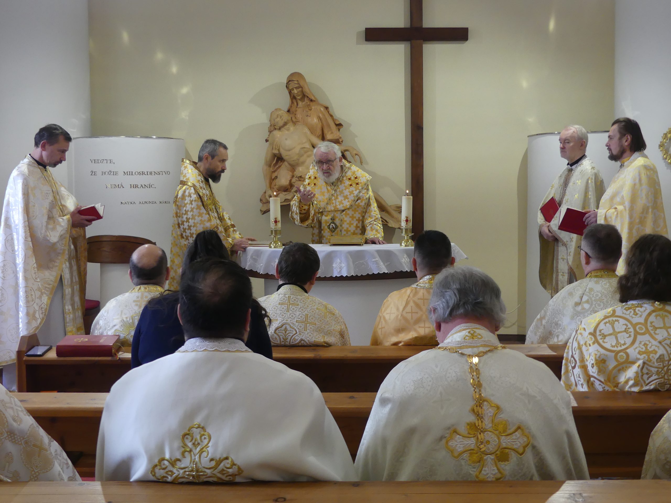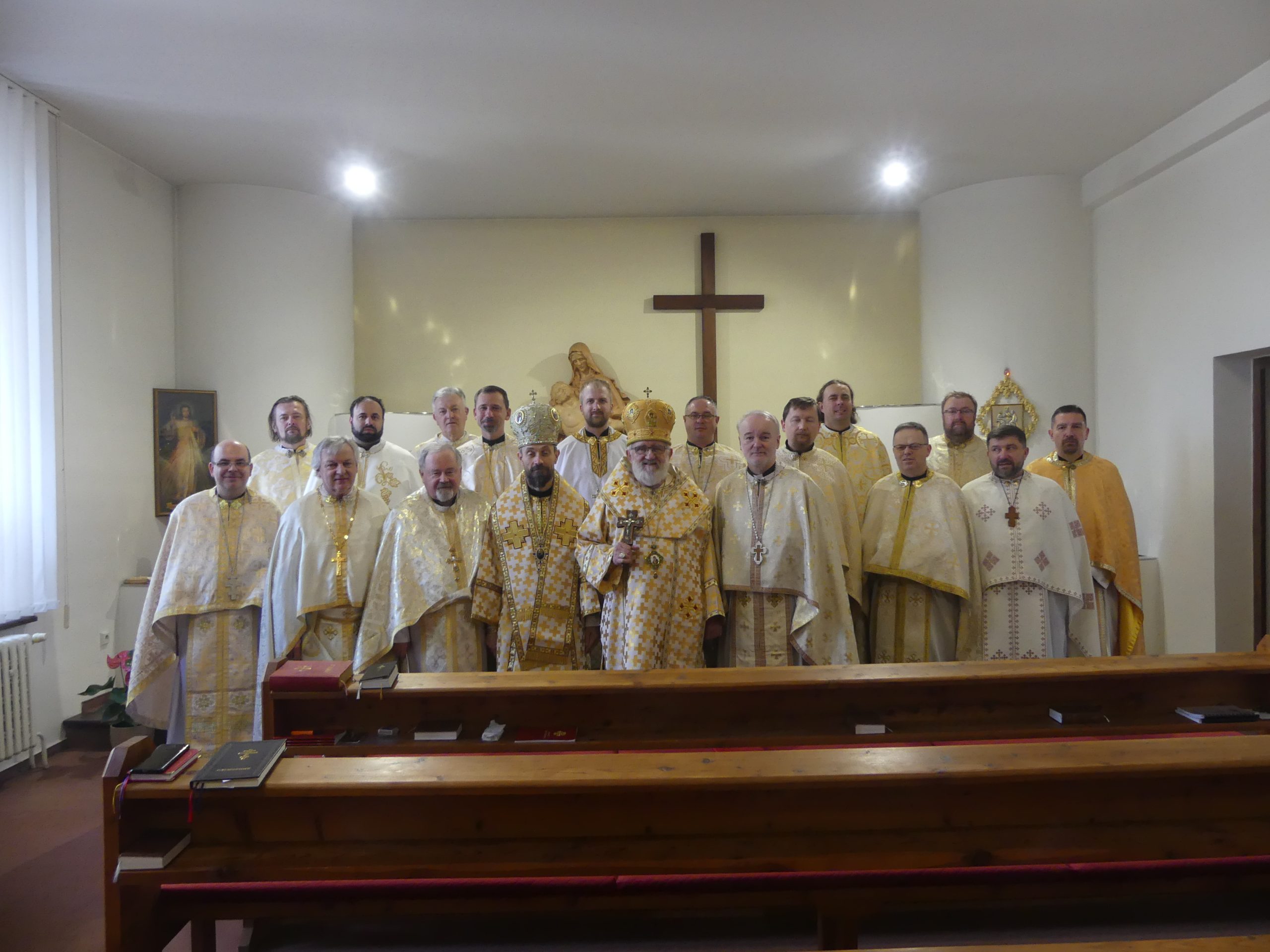 Dvojdňové stretnutie vyvrcholilo spoločným slávením božskej liturgie, ktorej predsedal vladyka Peter Rusnák. Vo svojej homílii pripomenul, že v týchto dňoch (30. januára) si budeme pripomínať 18. výročie povýšenia našej cirkvi na metropolitnú a tiež 18. výročie zriadenia eparchie. Toto Božie požehnanie pre našu Cirkev je podľa vladyku ovocím utrpenia nasej Cirkvi počas v minulosti. Kňazov povzbudil, aby svoje kresťanské svedectvo vydávali v každodennom živote, podľa príkladu sv. Jana Zlatoústeho, ktorého prenesenie relikvií si dnes naša Cirkev pripomína vo svojom liturgickom kalendári. V závere podujatia odznela pozvánka na slávenie eparchiálneho Dňa zasväteného života, ktorý sa bude konať 2. februára v Chráme sv. Cyrila a Metoda v Trenčíne.