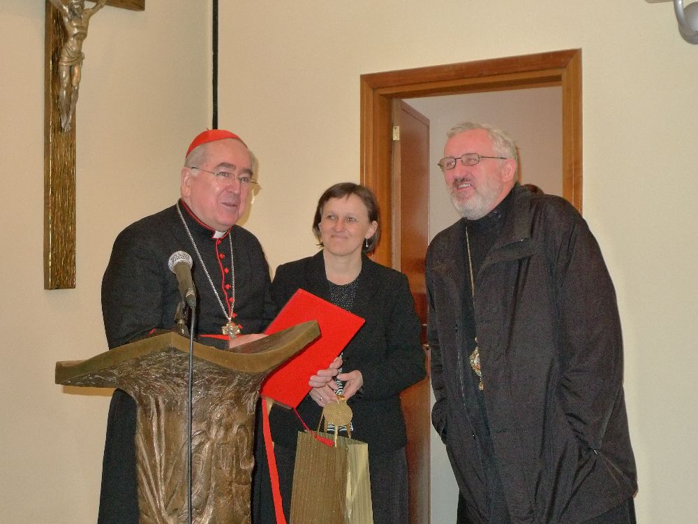 Foto 2: (Zľava) kardinál Stanislaw Rylko, predseda Pápežskej rady pre laikov, Katarína Hulmanová a biskup Rusnák počas minuloročnej púte hnutí a združení v Ríme.