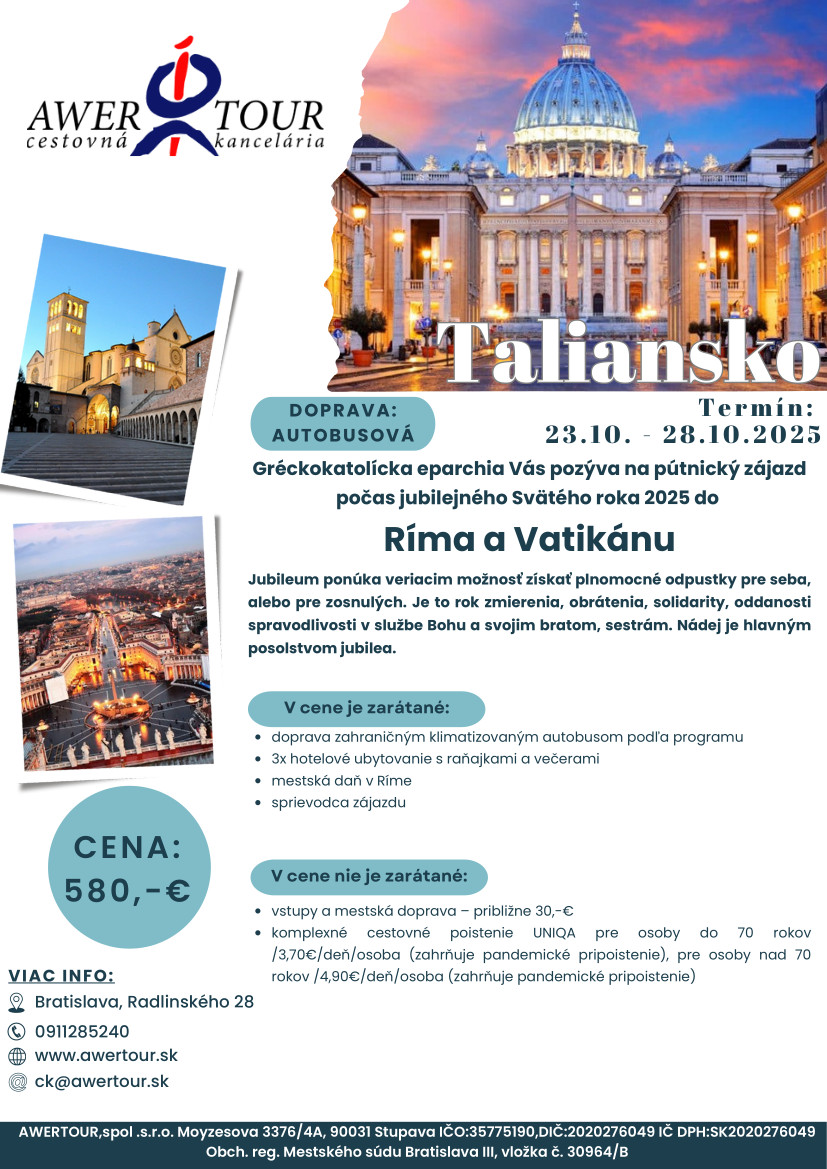 Gréckokatolícka eparchia Bratislava Vás pozýva na pútnický zájazd počas jubilejného Svätého roka 2025 do Ríma a Vatikánu