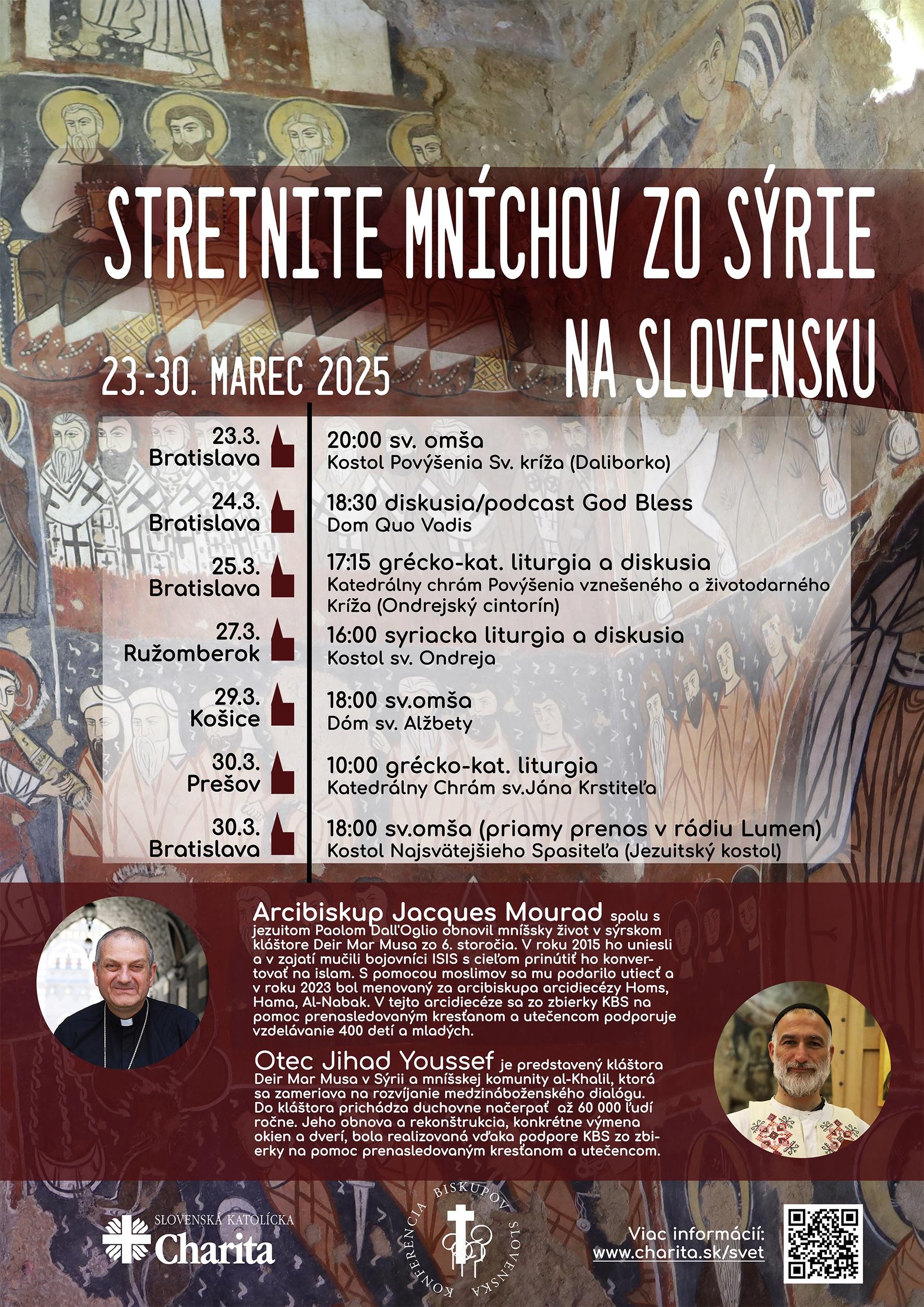 Na sviatok Zvestovania presvätej Bohorodičke (25. marca 2025) navštívili bratislavskú eparchiu arcibiskup z Homsu (Arcidiecéza Homs-Hama-Nabk, Sýrska katolícka cirkev Antiochijskej tradície) Mons. Jacques Mourad (Julian Yacoub Murad) a mních Jihad Youssef, predstavený kláštora Dei Mar Musa zo Sýrie, ktorí sú na Slovensku na pozvanie Slovenskej katolíckej charite (SKCH). Ich návšteva súvisí s blížiacou sa Zbierkou na pomoc prenasledovaným kresťanom a utečencom., ktorá o.i. podporí vzdelávanie 400 detí a mládeže v Sýrii.