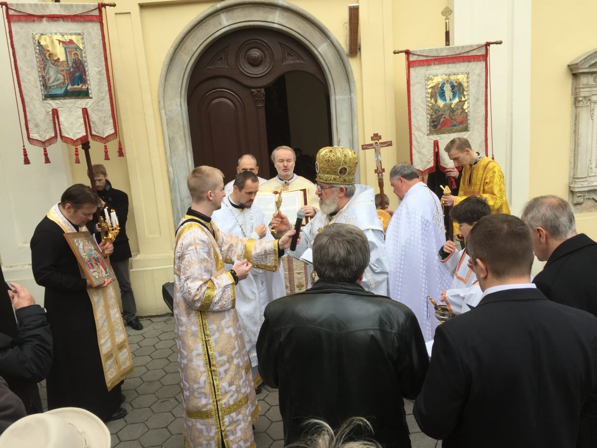 V pondelok Svetlého týždňa vladyka Peter slúžil v katedrále archijerejskú liturgiu o 9.00 hod., po ktorej nasledovalo myrovanie a tradičný sprievod okolo chrámu s čítaním štyroch voskreskných evanjelií.