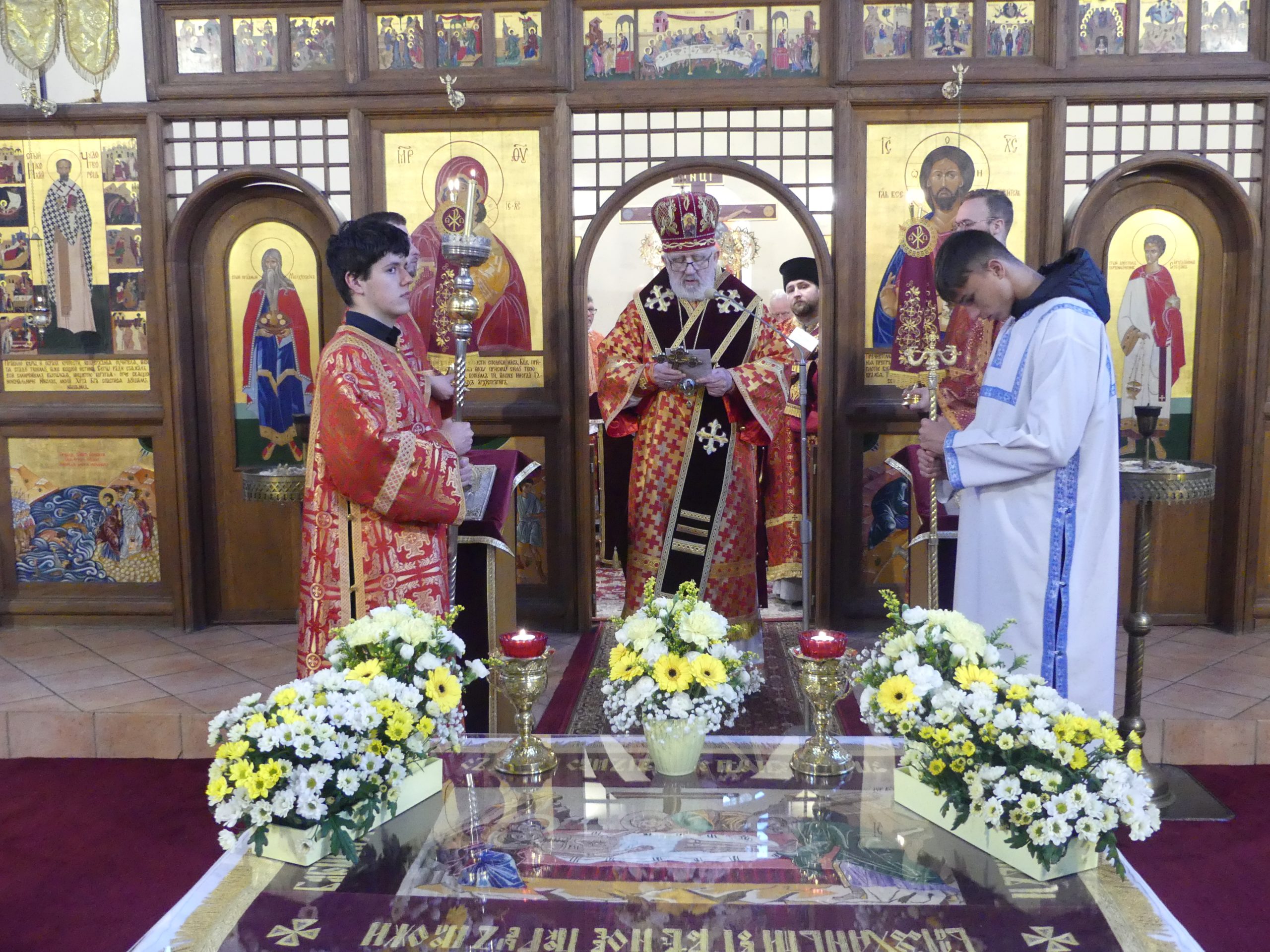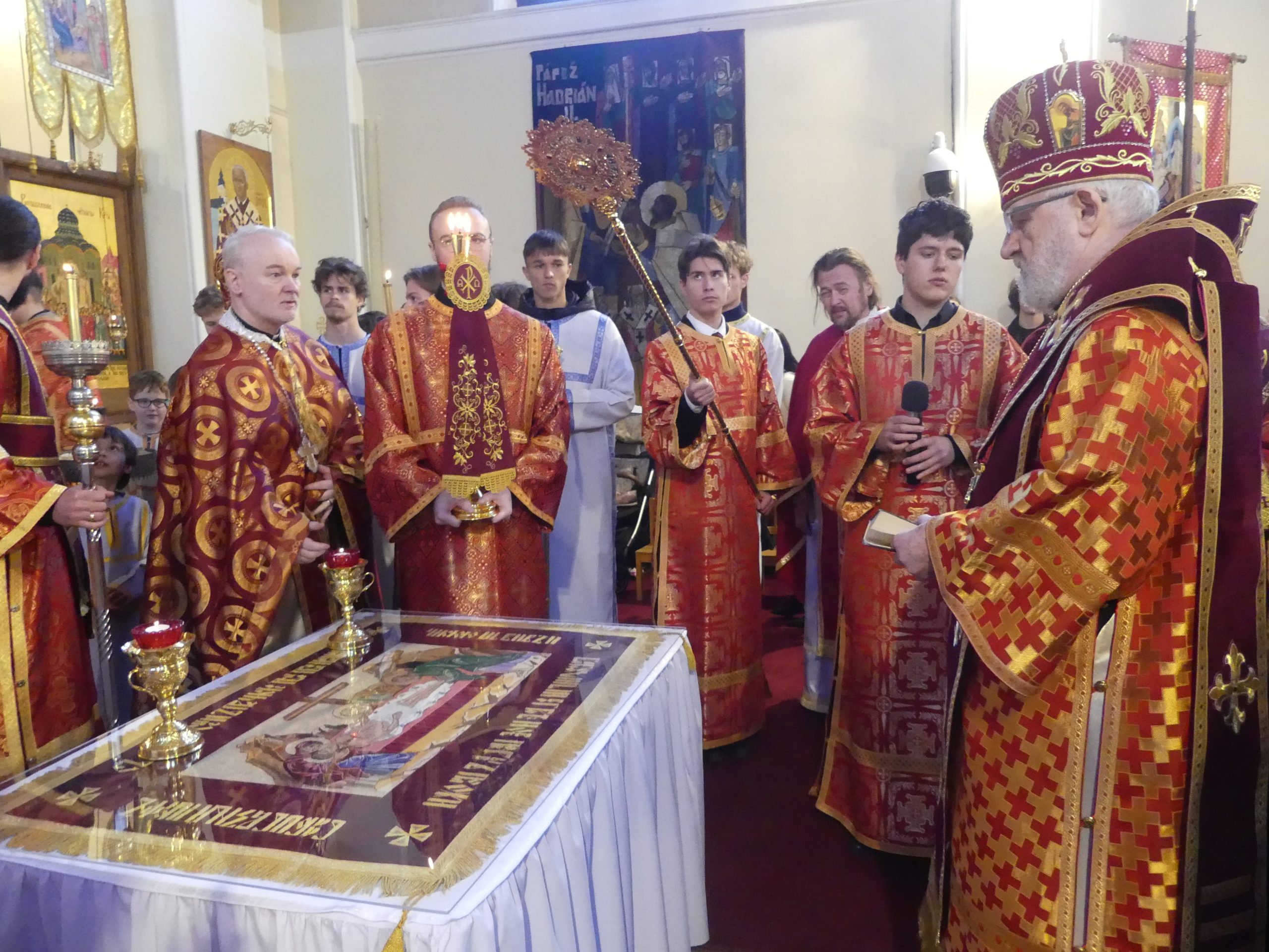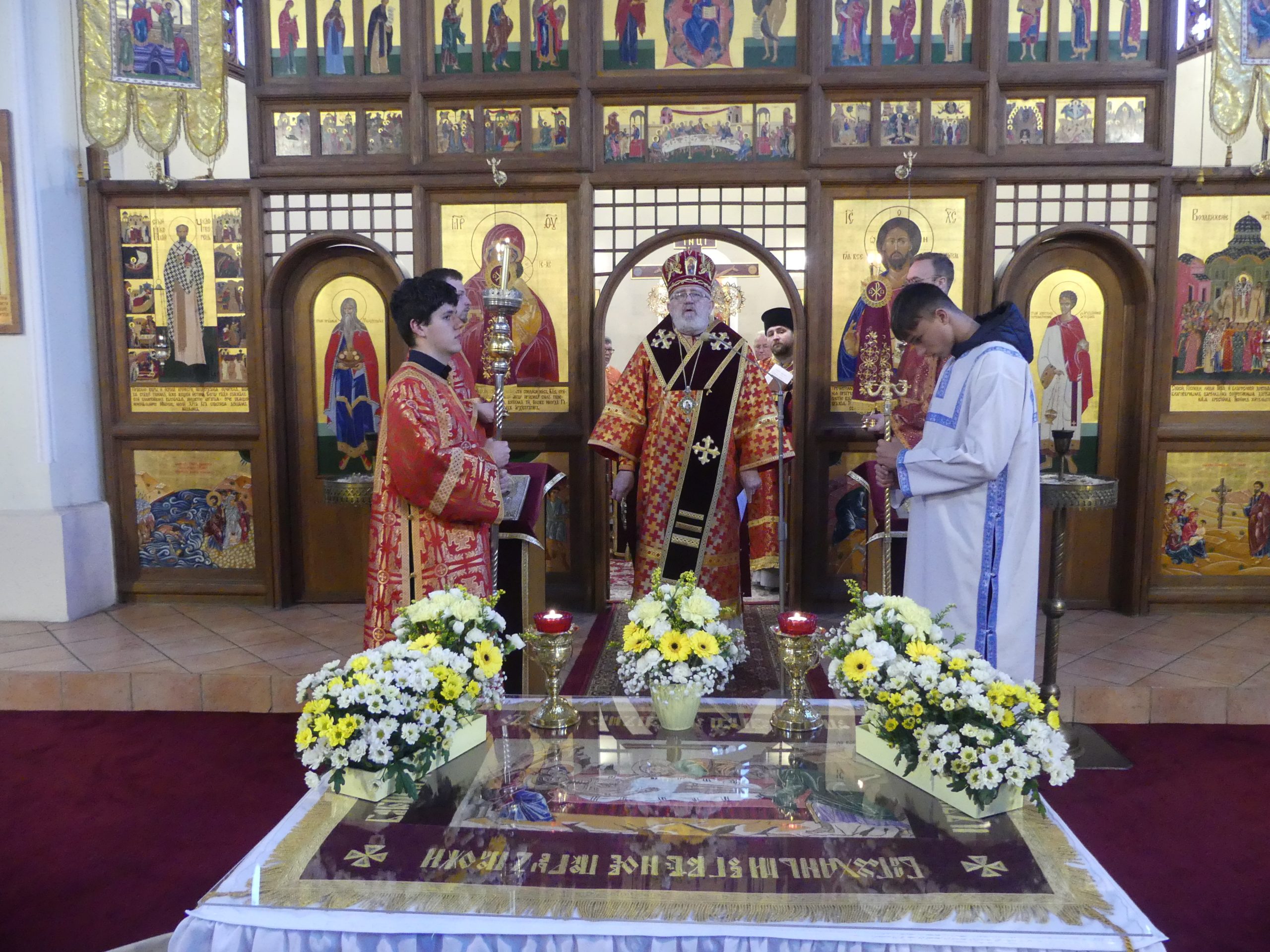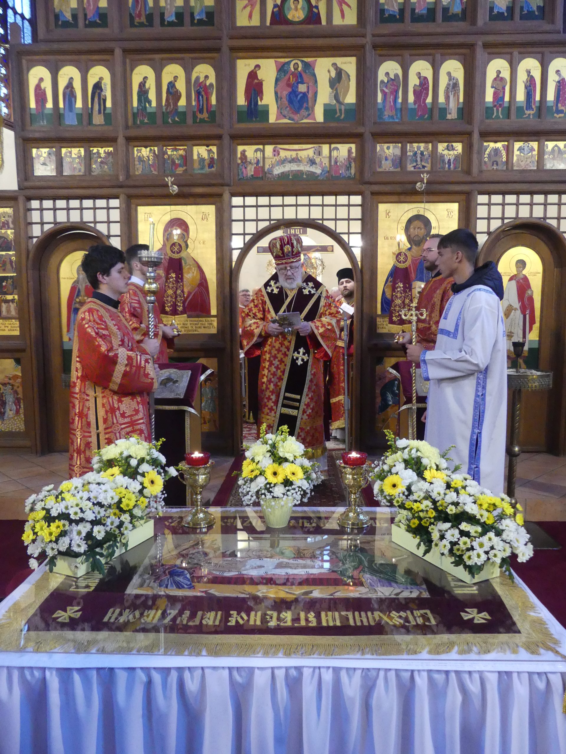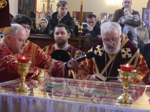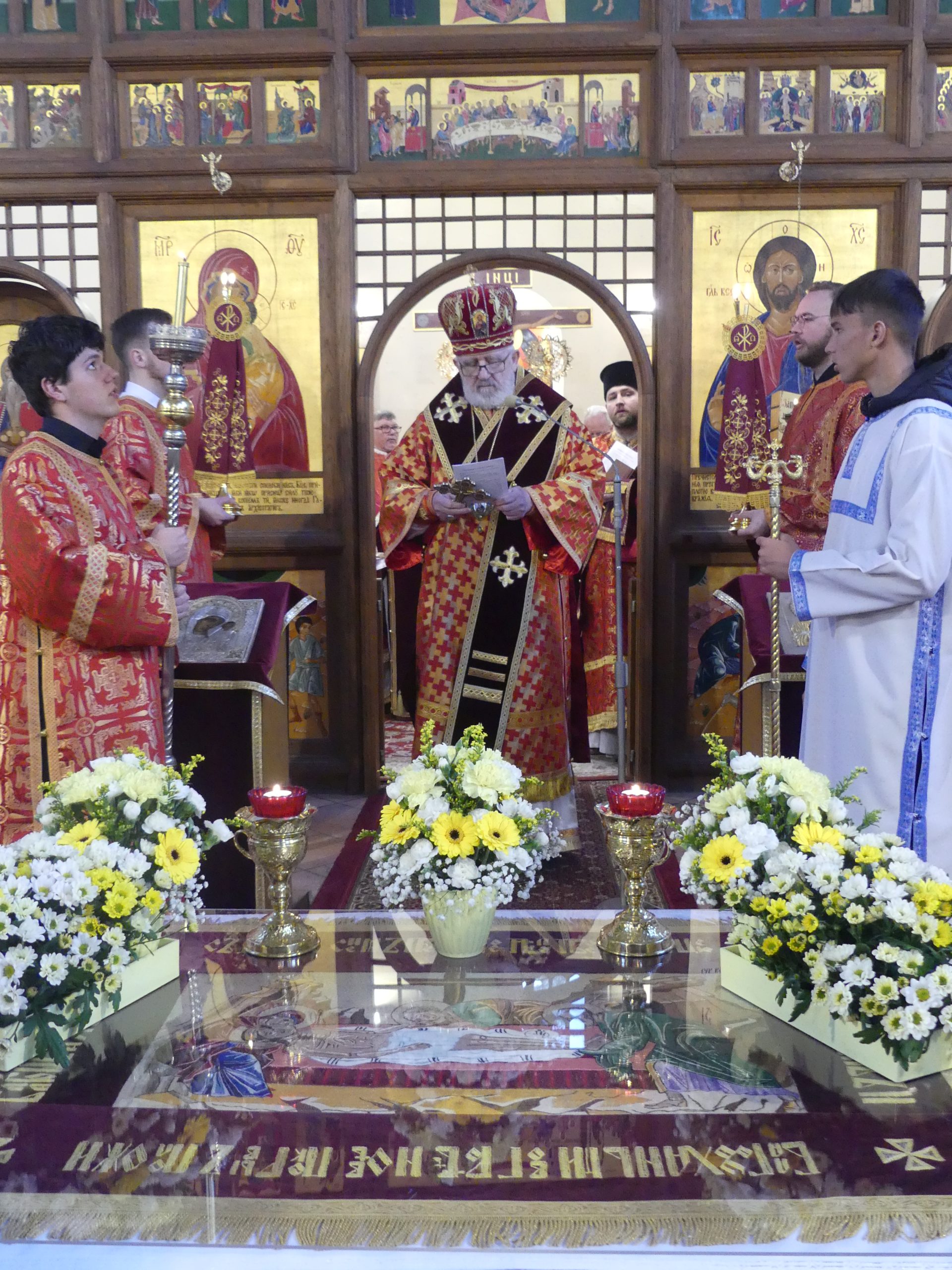 Poobede o 16.00 predsedal vladyka Peter obradom veľkopiatkovej večierne spojenej so sprievodom okolo chrámu s plaštenicou a jej následným uložením uprostred chrámu. Prítomní veriaci si potom poklonou a bozkom uctili plaštenicu, symbolizujúcu plachty, do ktorých bol Ježiš zabalený a uložený v hrobe.