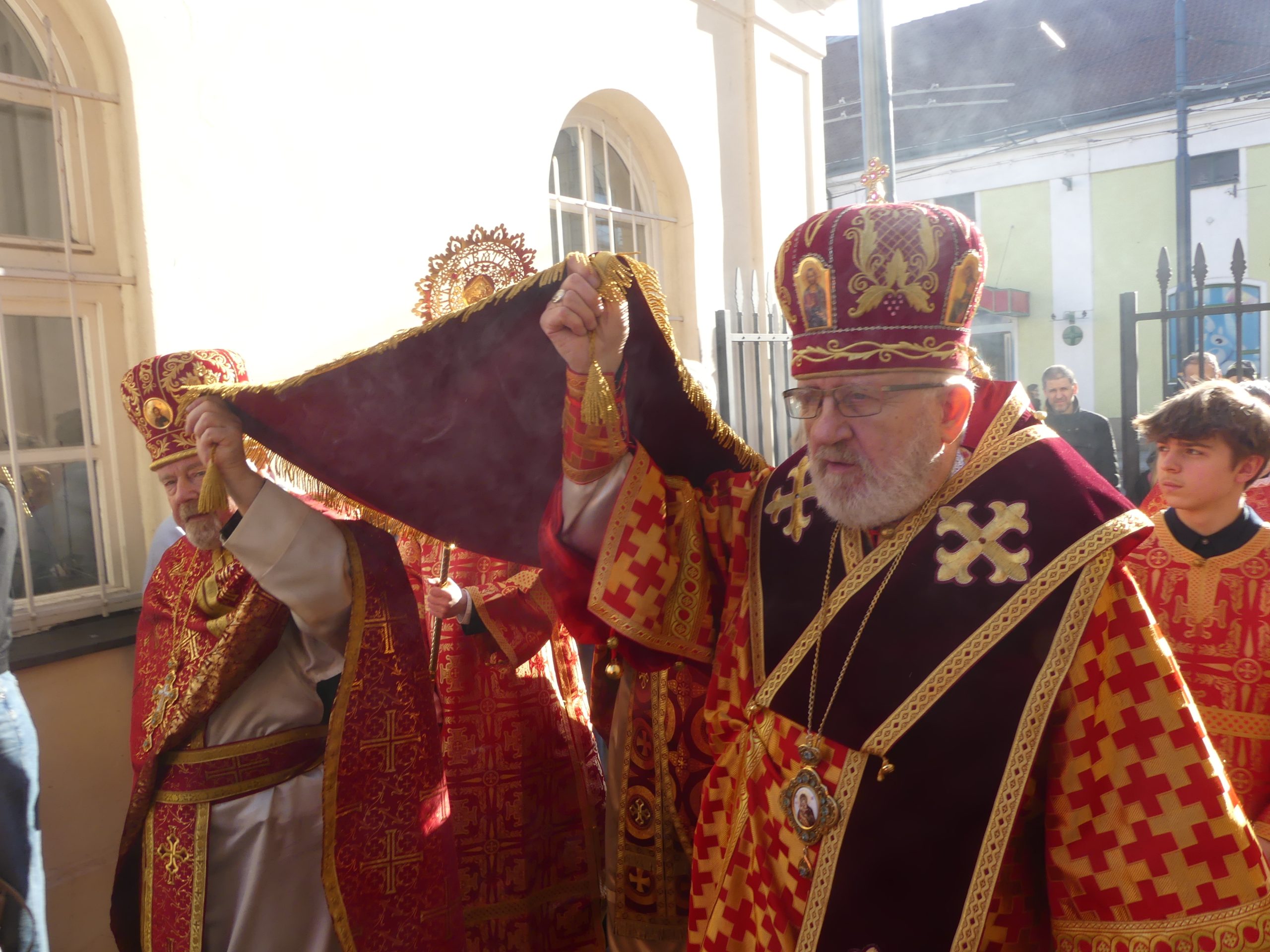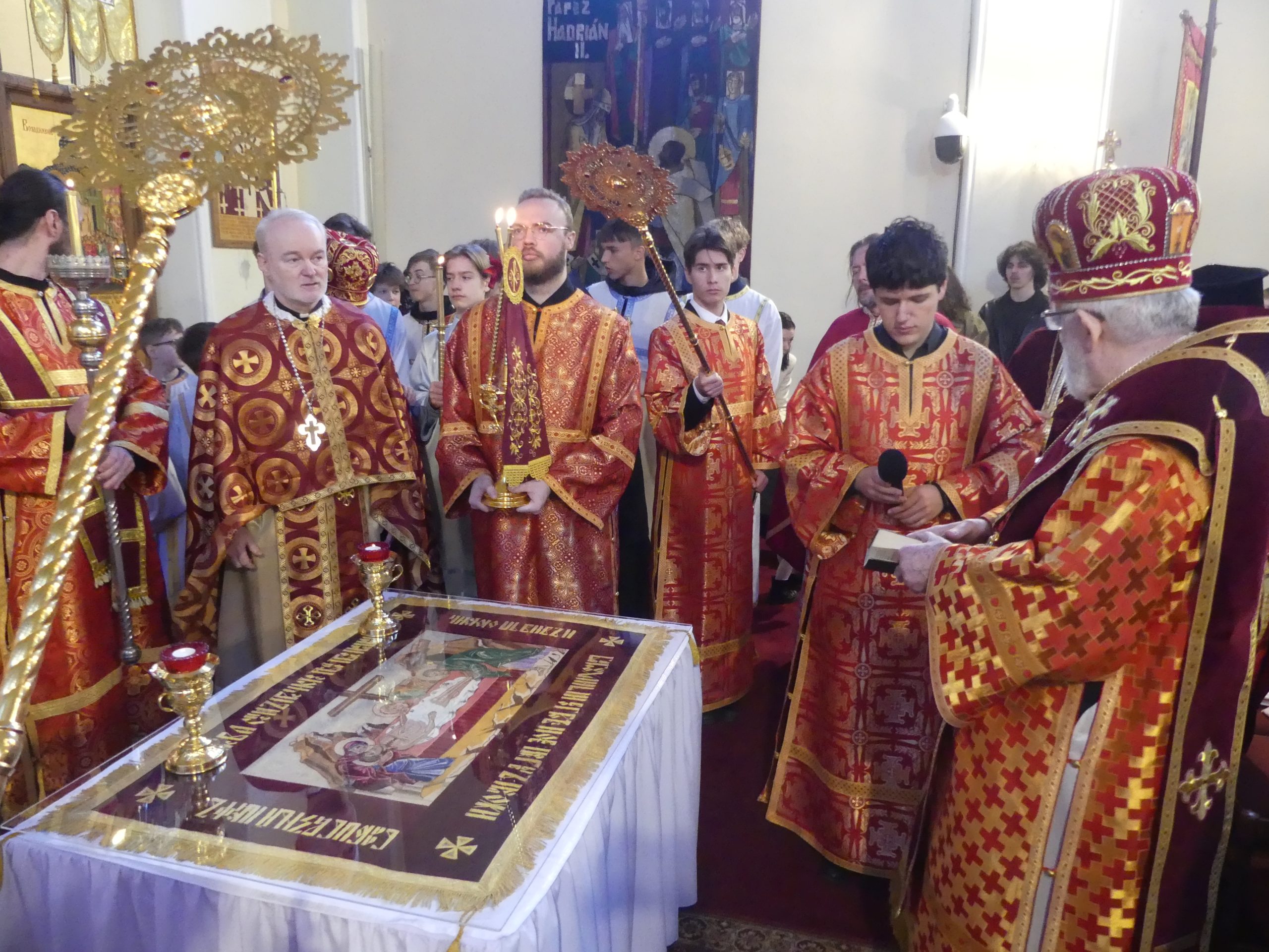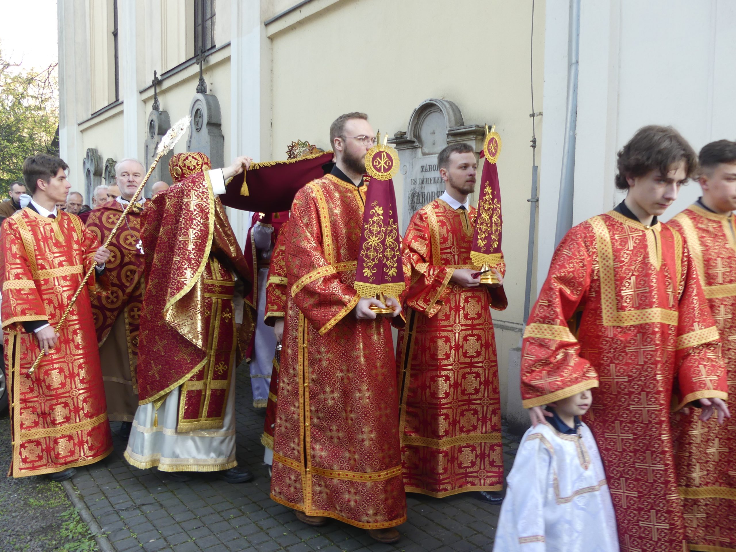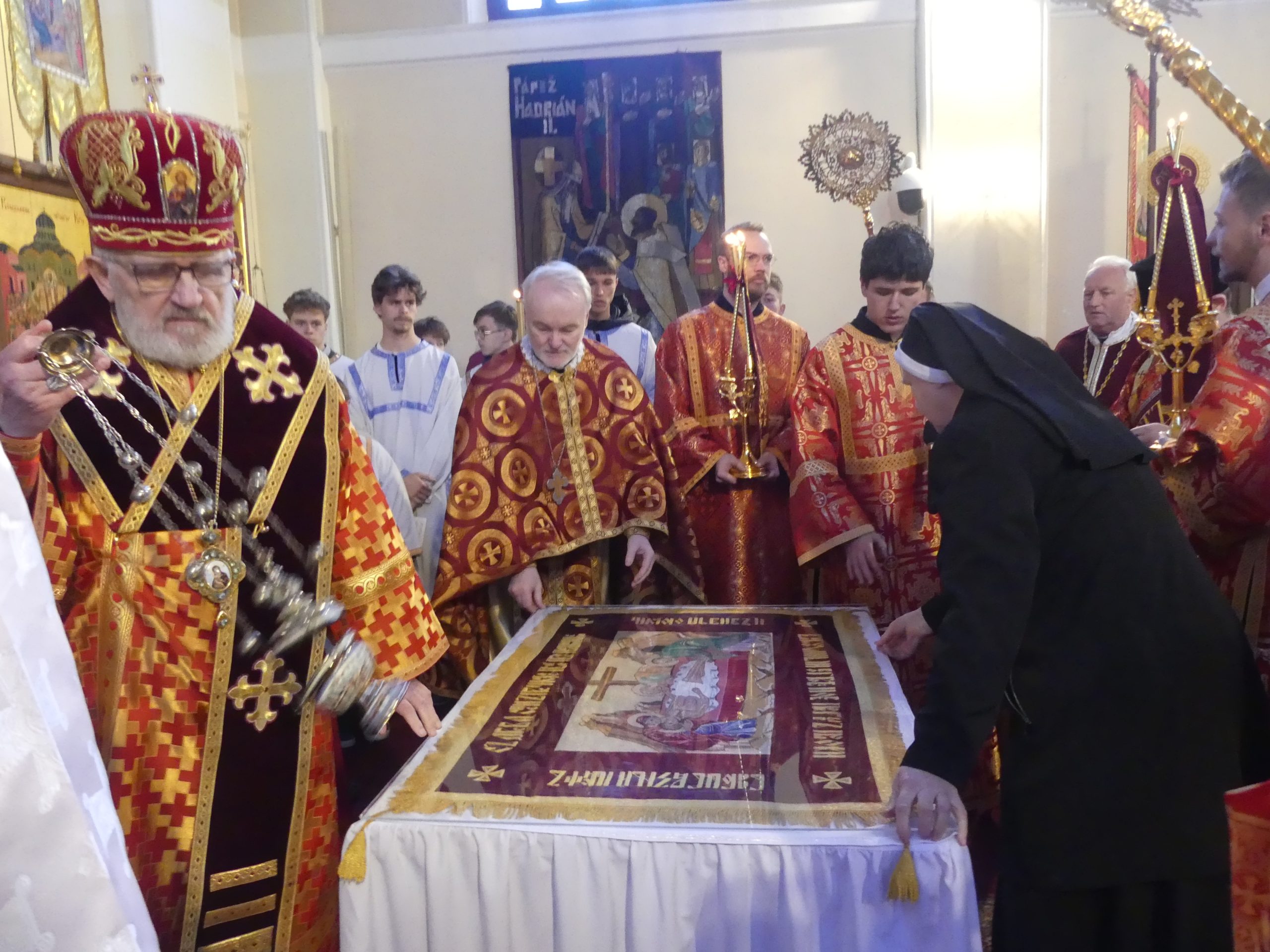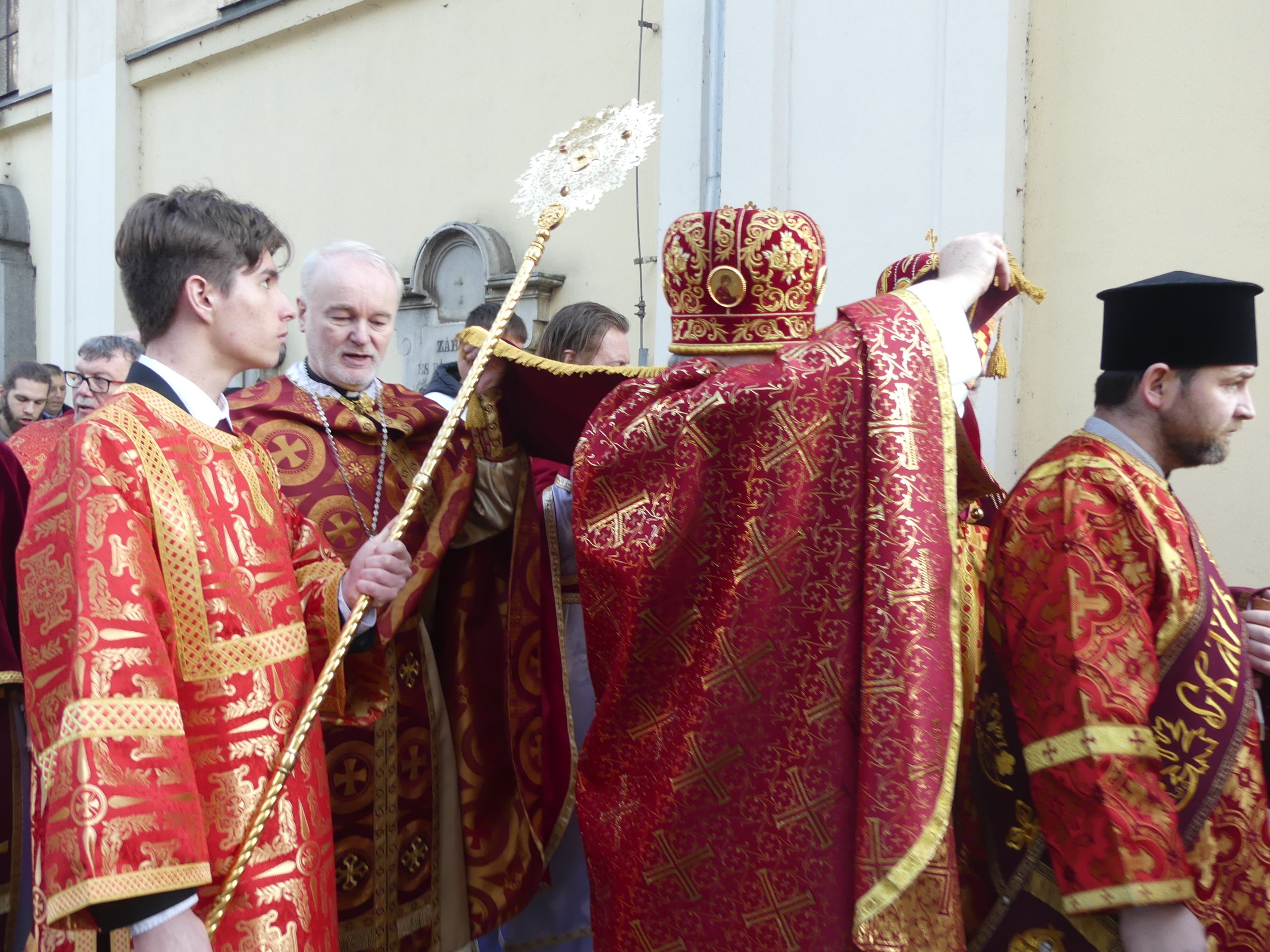 Poobede o 16.00 predsedal vladyka Peter obradom veľkopiatkovej večierne spojenej so sprievodom okolo chrámu s plaštenicou a jej následným uložením uprostred chrámu. Prítomní veriaci si potom poklonou a bozkom uctili plaštenicu, symbolizujúcu plachty, do ktorých bol Ježiš zabalený a uložený v hrobe.