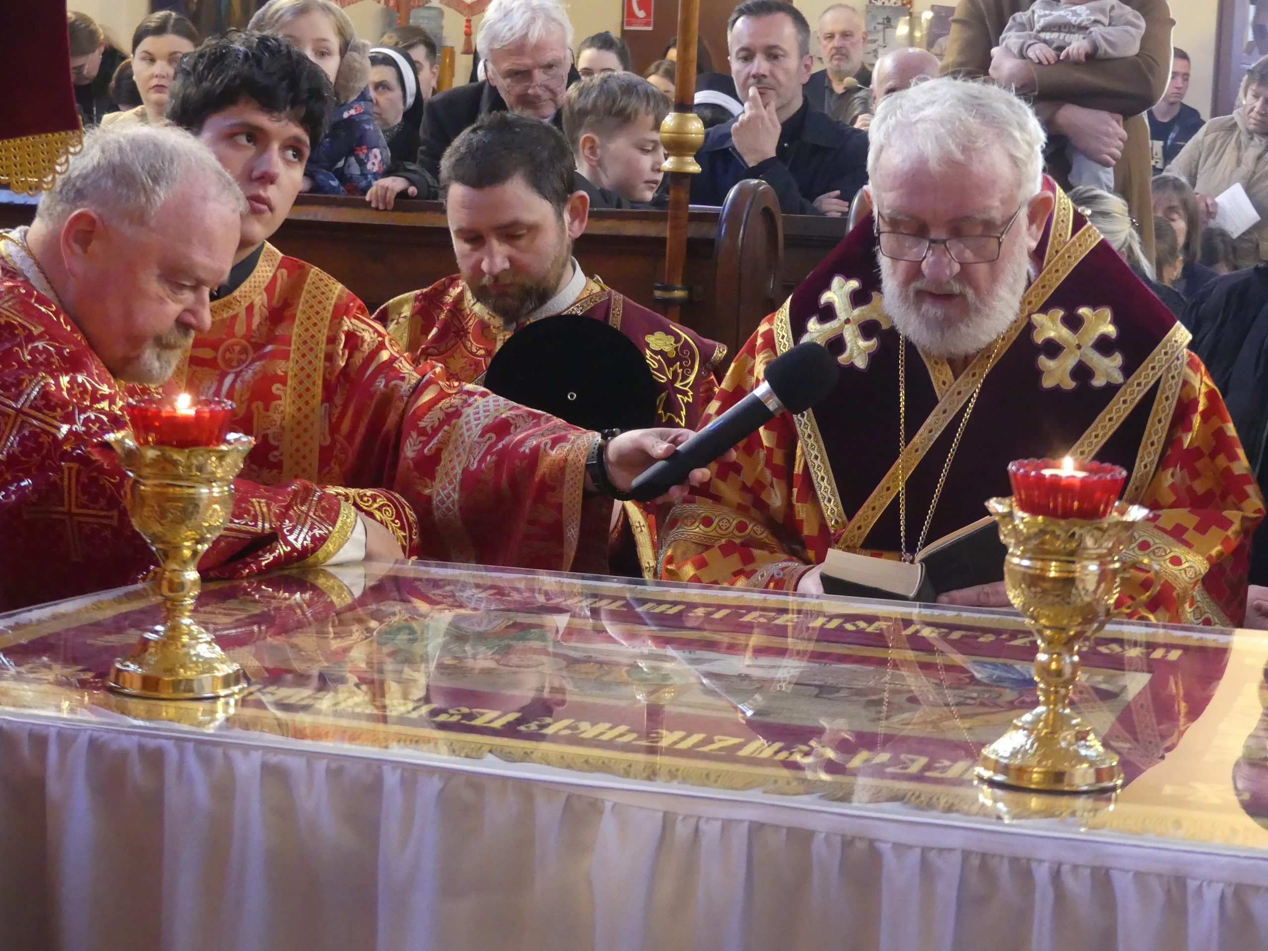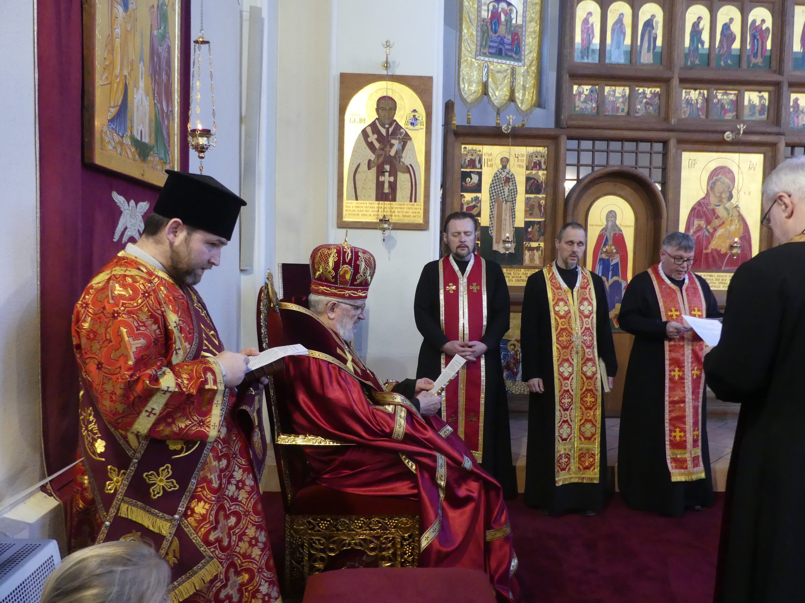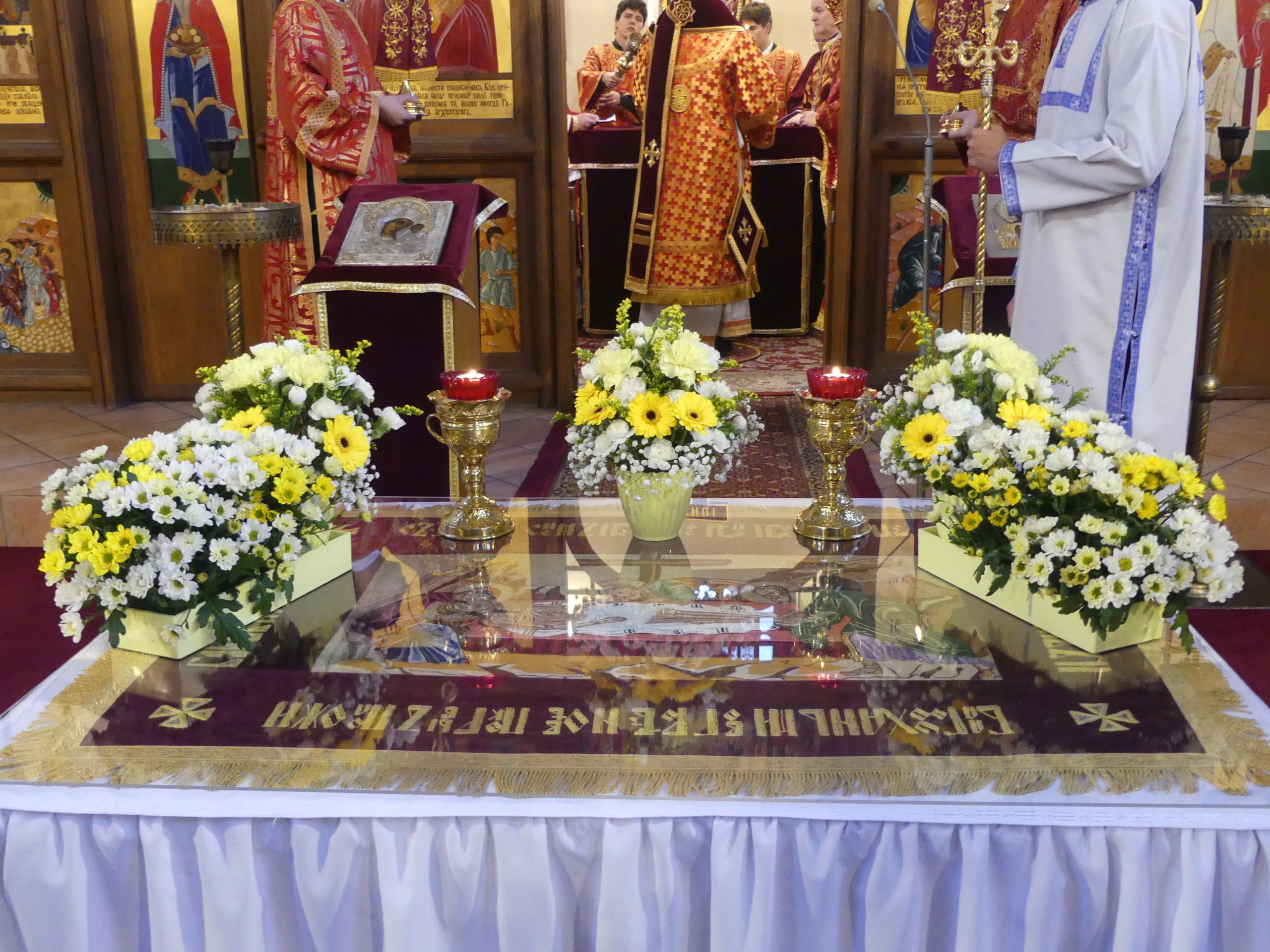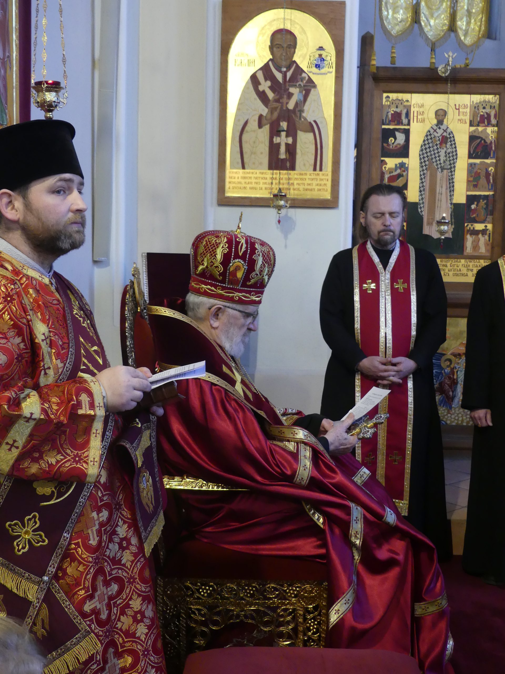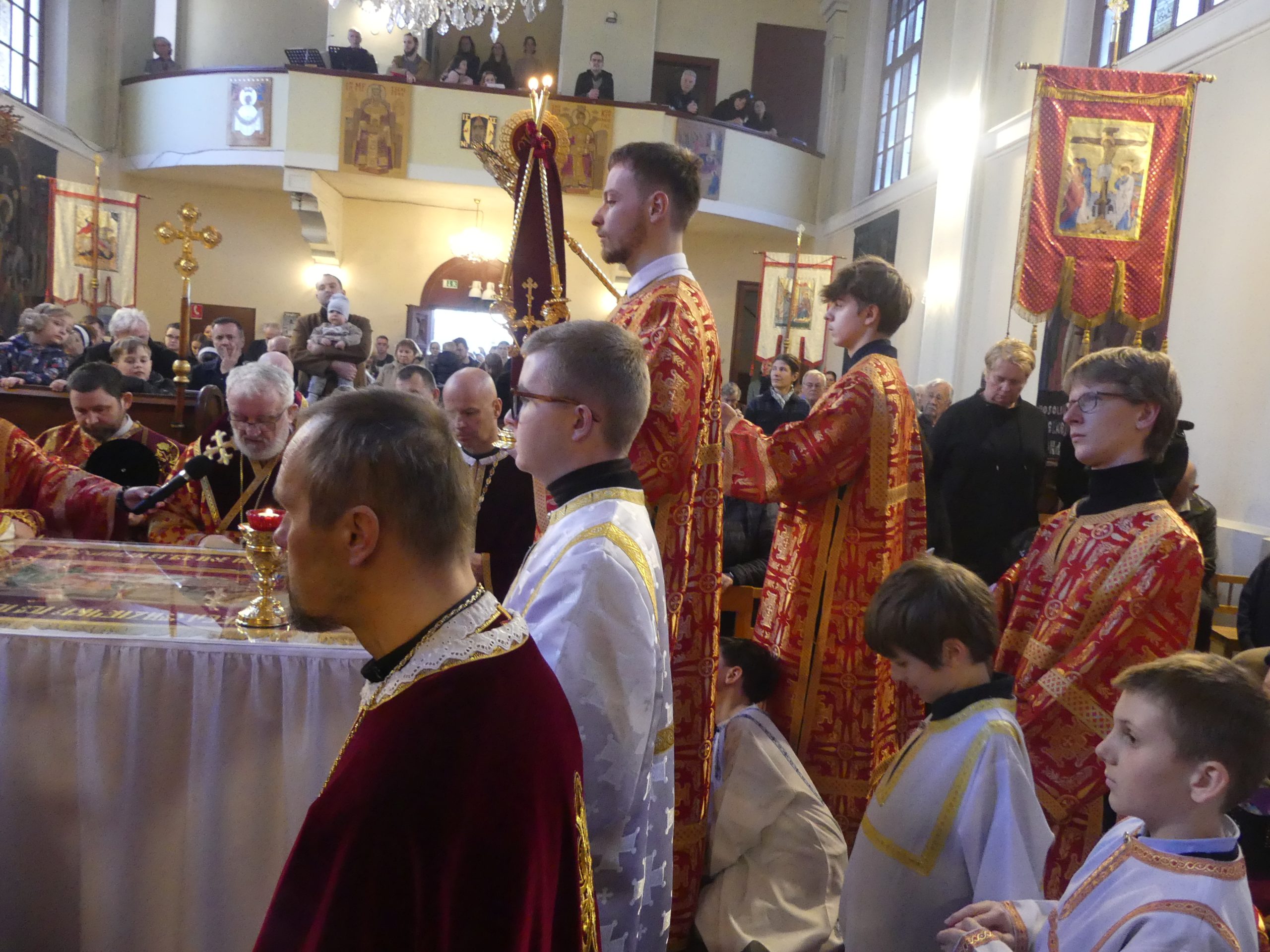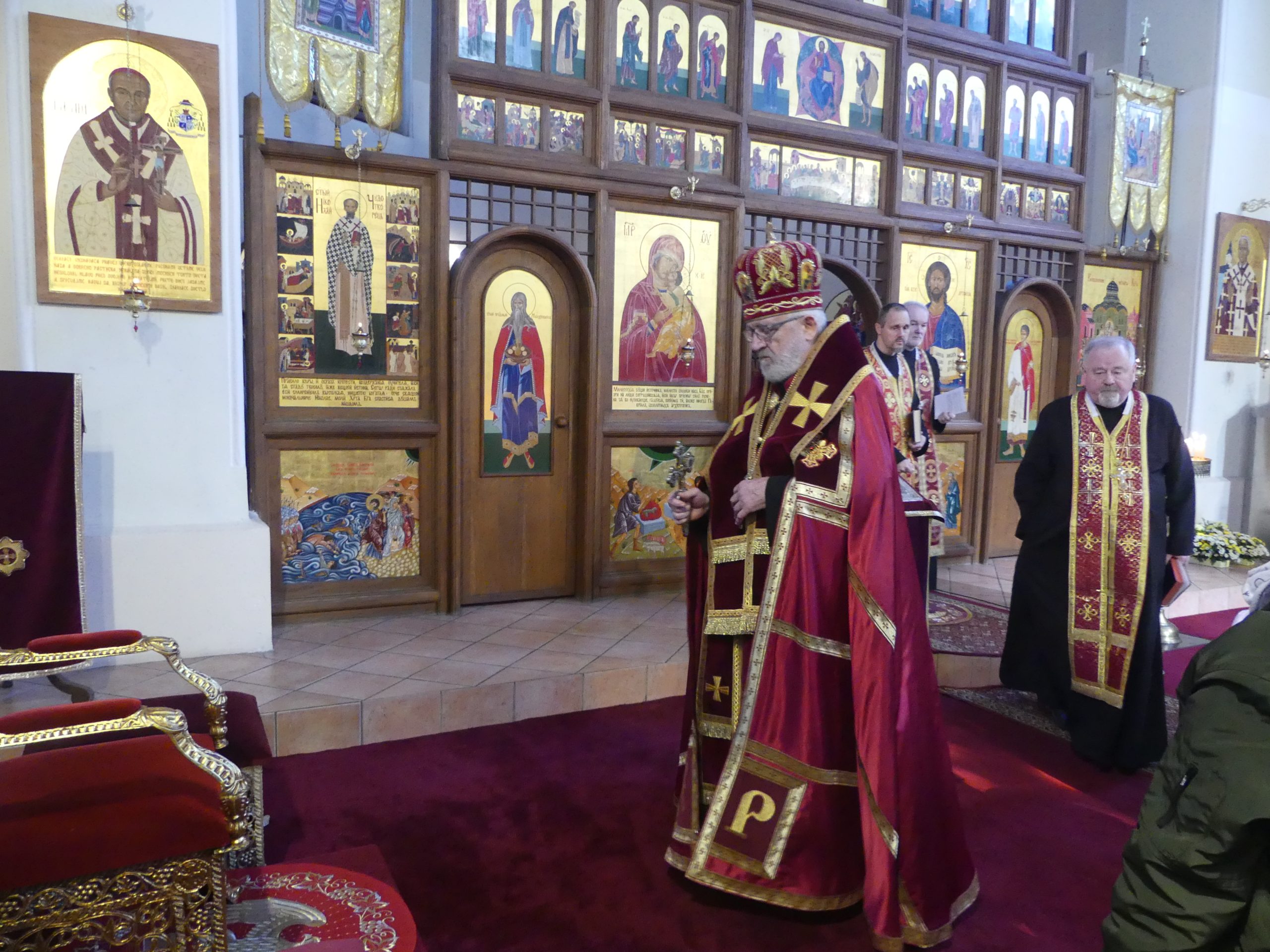 Poobede o 16.00 predsedal vladyka Peter obradom veľkopiatkovej večierne spojenej so sprievodom okolo chrámu s plaštenicou a jej následným uložením uprostred chrámu. Prítomní veriaci si potom poklonou a bozkom uctili plaštenicu, symbolizujúcu plachty, do ktorých bol Ježiš zabalený a uložený v hrobe.