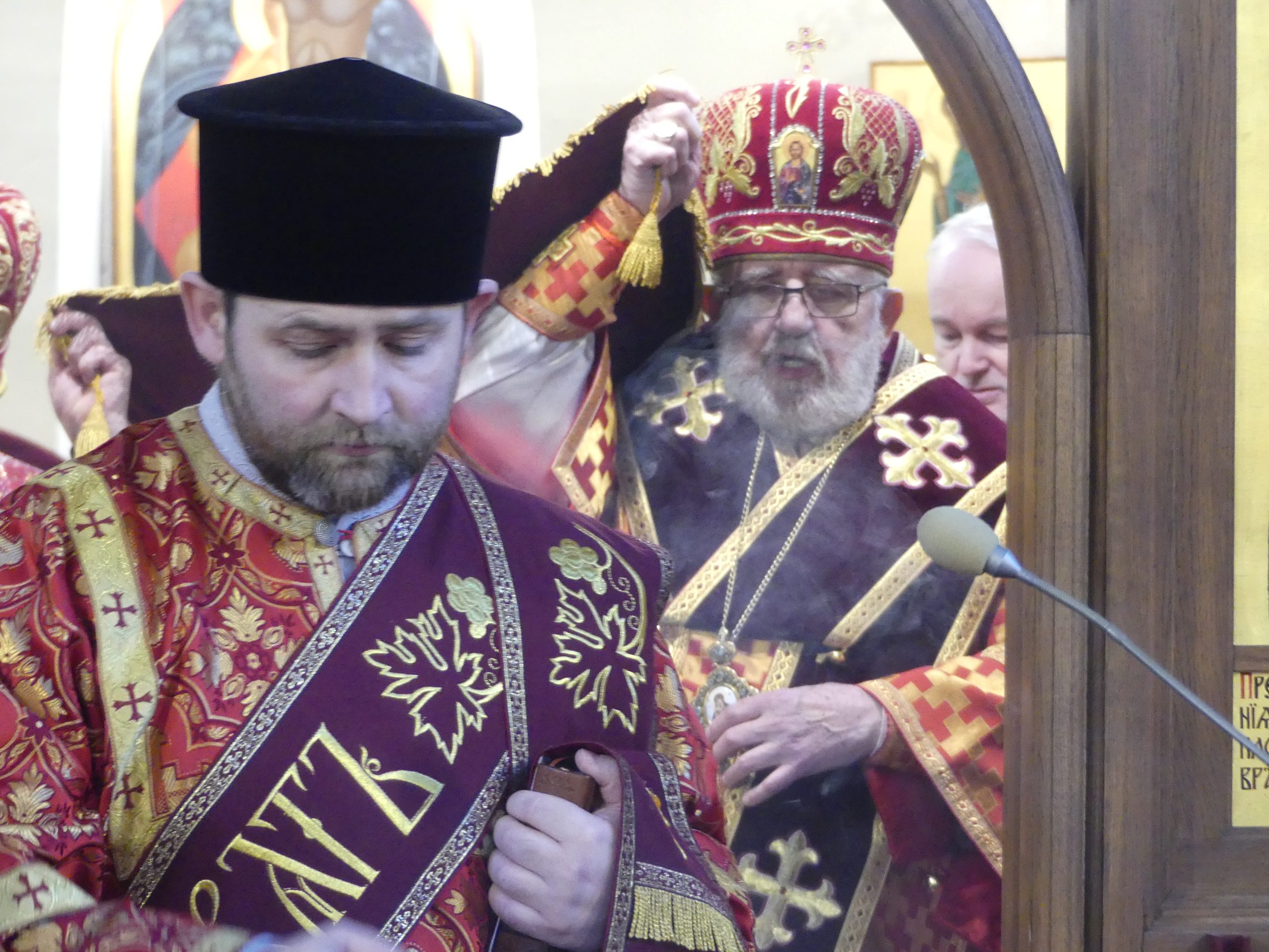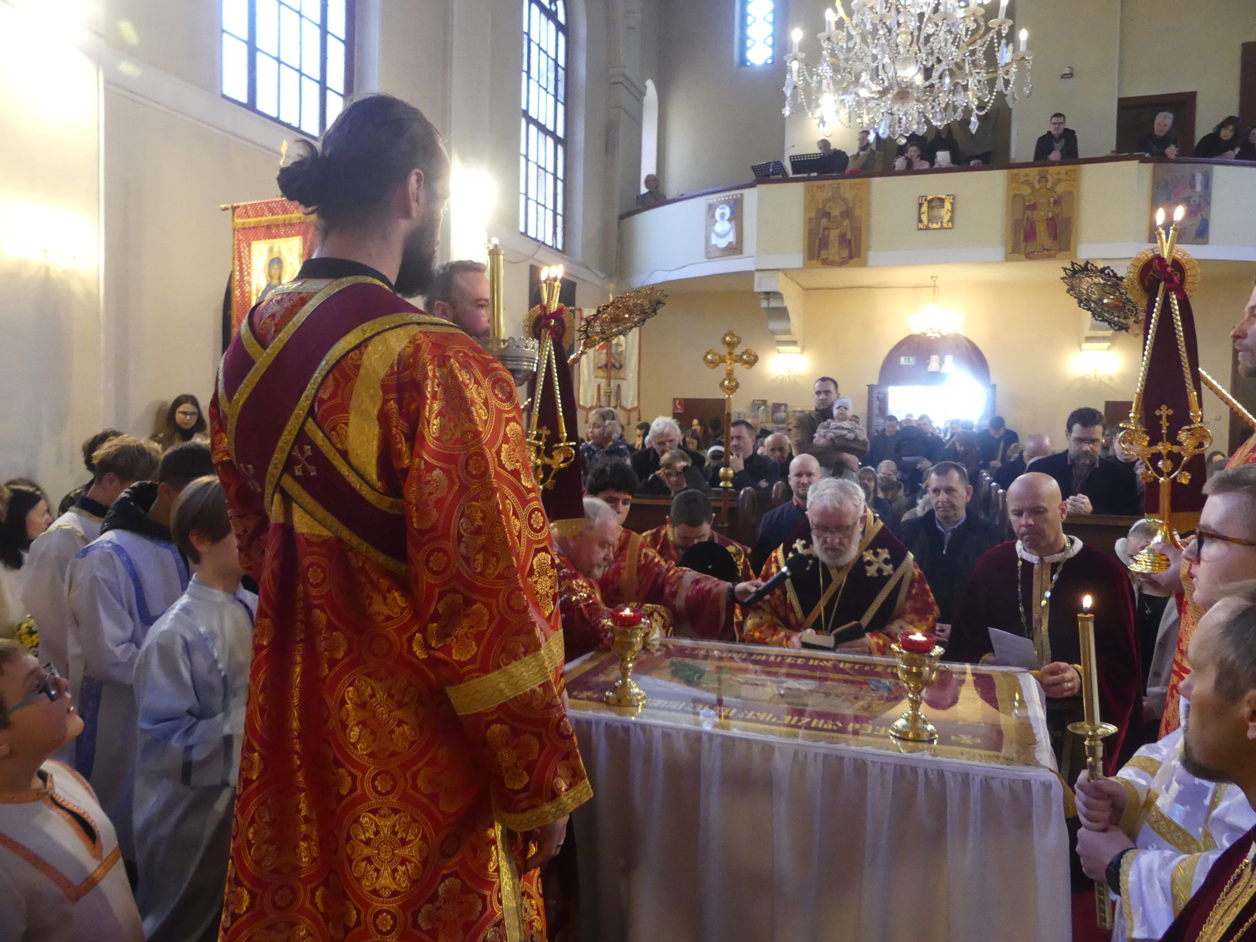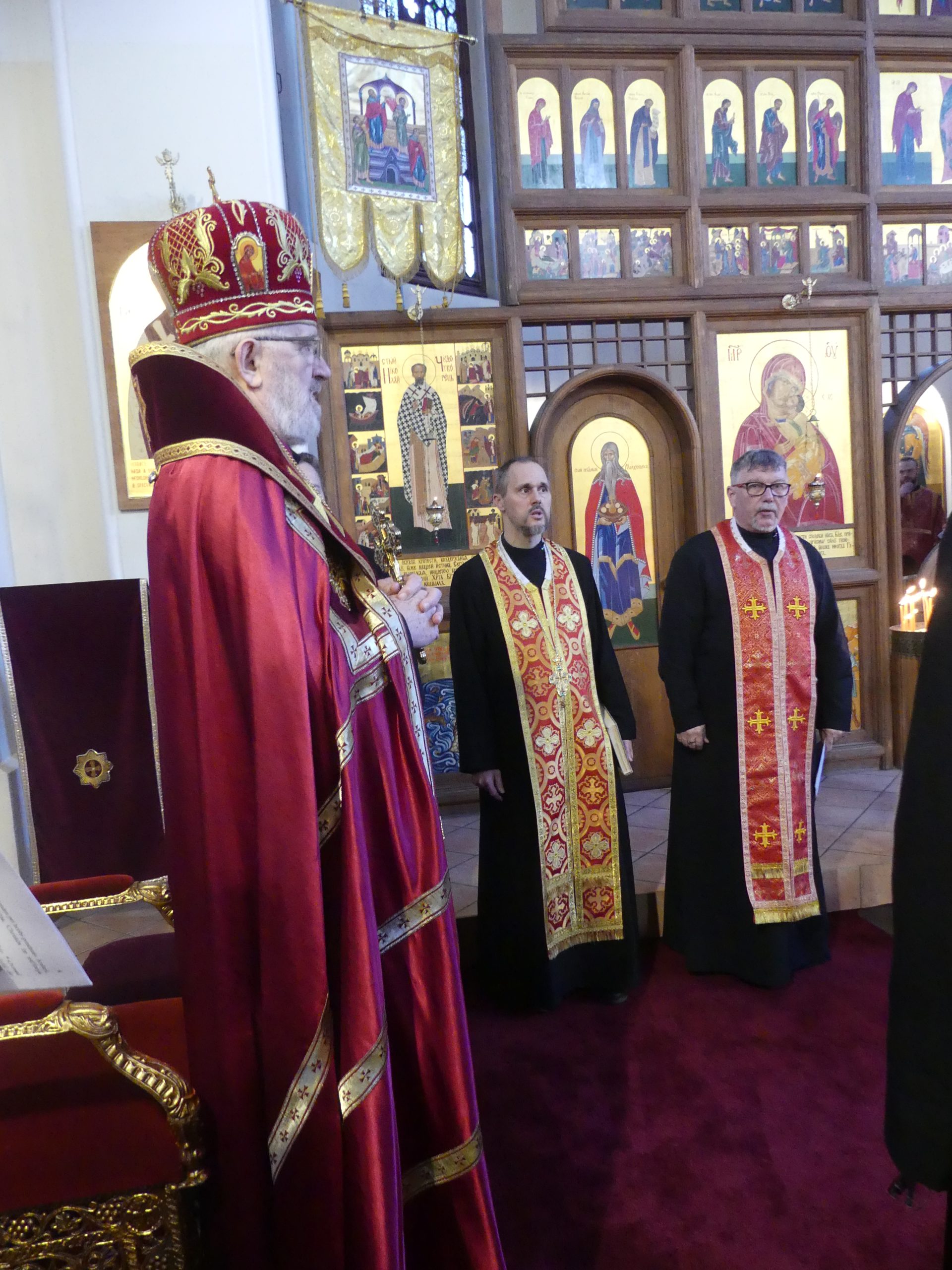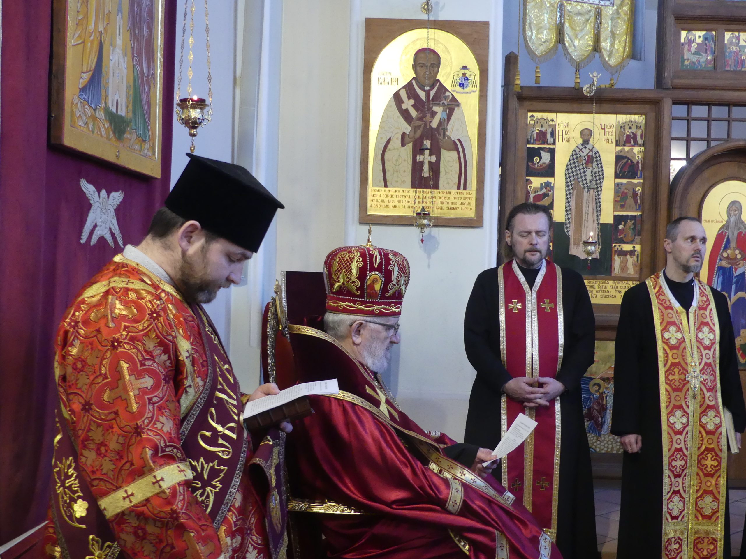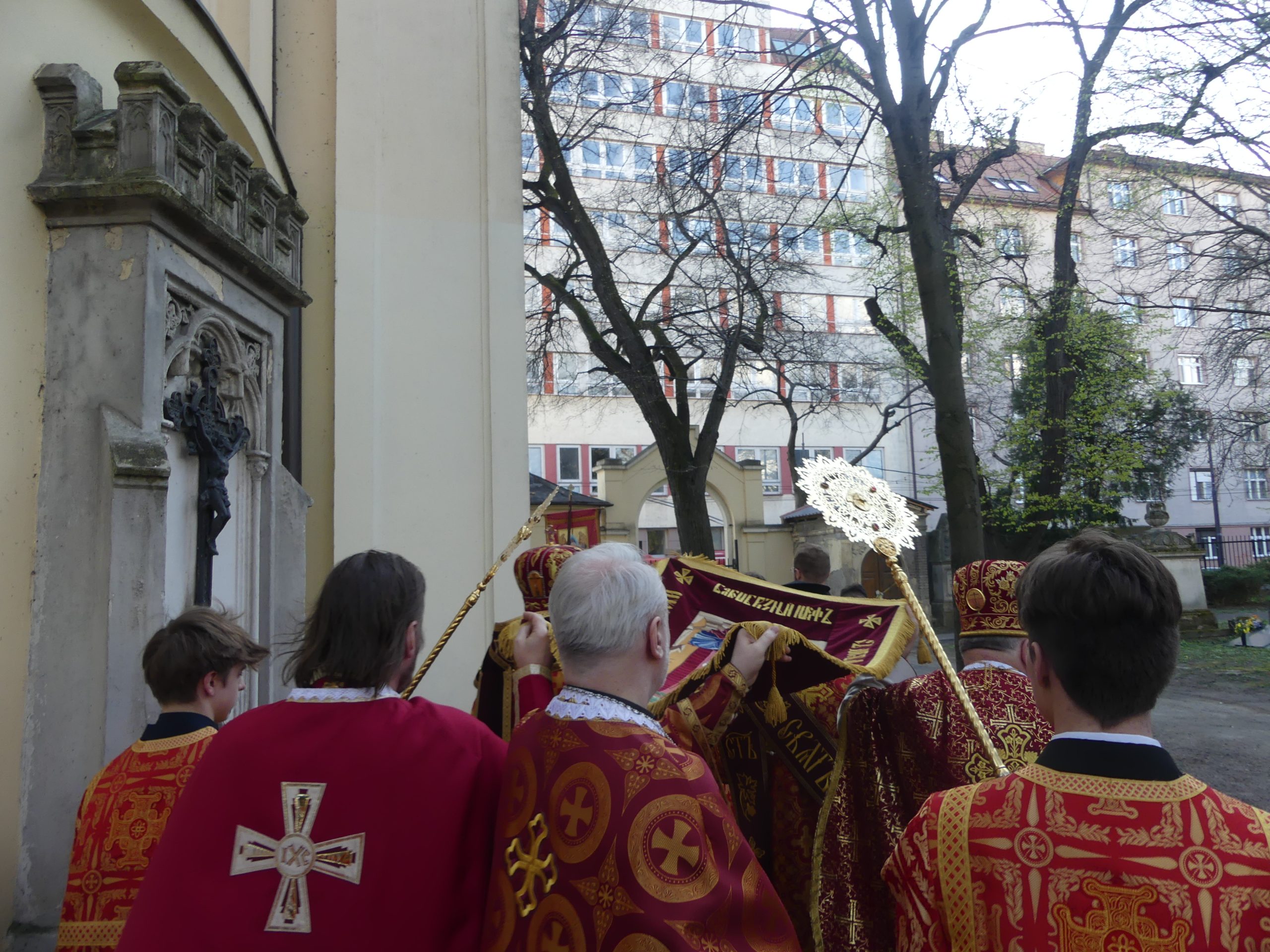 Poobede o 16.00 predsedal vladyka Peter obradom veľkopiatkovej večierne spojenej so sprievodom okolo chrámu s plaštenicou a jej následným uložením uprostred chrámu. Prítomní veriaci si potom poklonou a bozkom uctili plaštenicu, symbolizujúcu plachty, do ktorých bol Ježiš zabalený a uložený v hrobe.