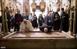 „Isteže nemôžeme poprieť rozdelenia, ktoré ešte existujú medzi nami, Ježišovými učeníkmi. Toto posvätné miesto nám umožňuje s ešte väčším utrpením precítiť túto drámu. Predsa však, päťdesiat rokov od objatia tých dvoch ctihodných otcov, uznajme s vďačnosťou a obnoveným úžasom, ako bolo možné na podnet Ducha Svätého, uskutočniť naozaj dôležité kroky smerom k jednote. Uvedomujeme si, že treba prejsť ešte inú cestu, aby sme dosiahli plnosť spoločenstva, ktorá by sa mohla prejaviť aj v účasti na tom istom eucharistickom stole, a ktorú si vrúcne želáme. Avšak odlišnosti nás nemajú vyľakať, nemôžu nás vyľakať a ochromiť našu cestu. Musíme veriť, že ako bol kameň odvalený od hrobu, tak môžu byť odstránené všetky prekážky, ktoré ešte bránia plnému spoločenstvu medzi nami. Bude to milosť zmŕtvychvstania, ktorej predchuť môžeme vnímať už dnes. Zakaždým, keď sa navzájom žiadame o odpustenie za hriechy spáchané voči iným kresťanom a vždy, keď máme odvahu dať i prijať toto odpustenie, okusujeme skúsenosť vzkriesenia! Zakaždým, keď prekonáme staré predsudky a máme odvahu vytvárať nové bratské vzťahy, vyznávame, že Kristus naozaj vstal z mŕtvych! Zakaždým, keď pri uvažovaní nad budúcnosťou Cirkvi vychádzame z jej povolania k jednote, žiari svetlo veľkonočného rána!,“ zdôraznil Svätý Otec František.