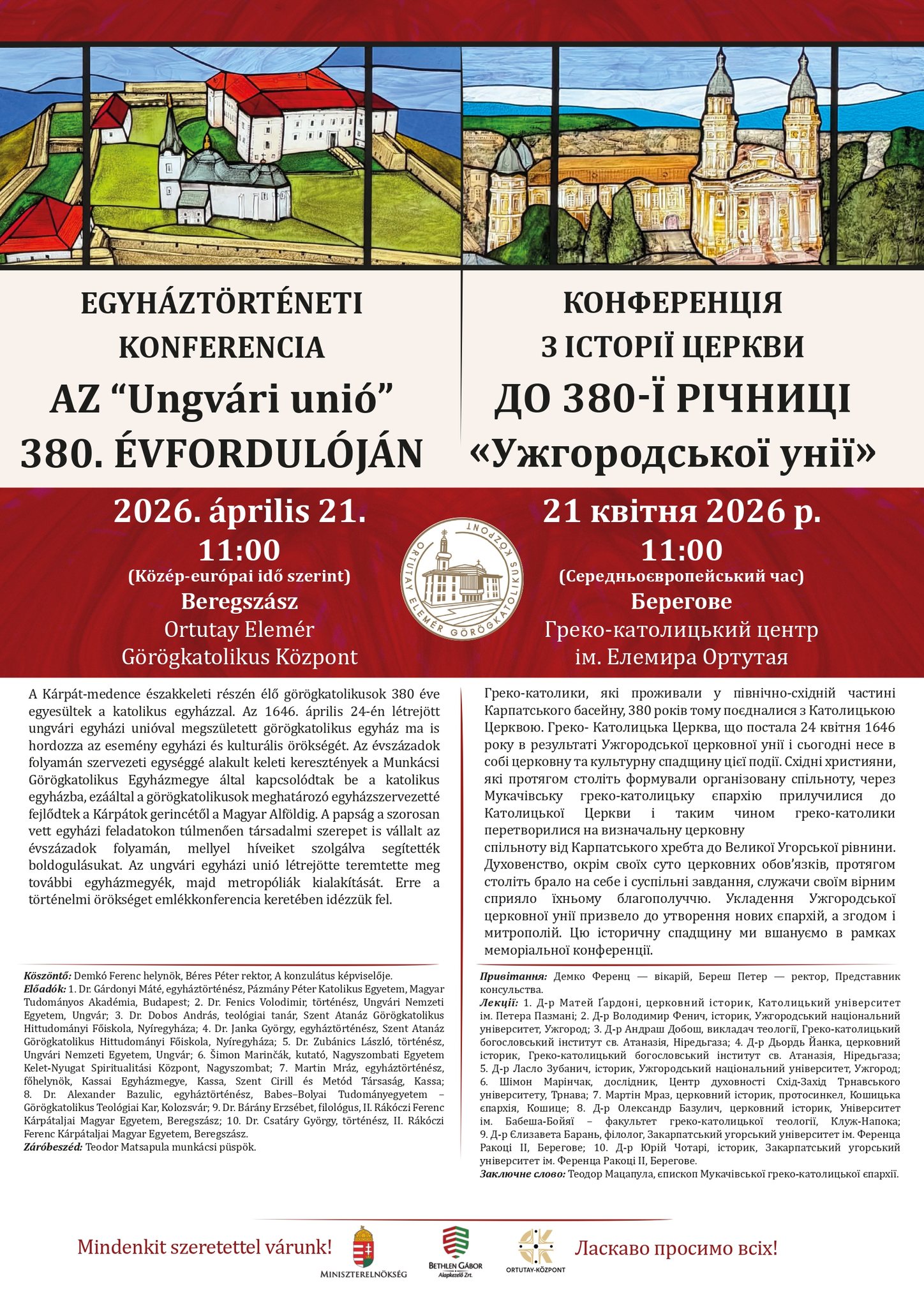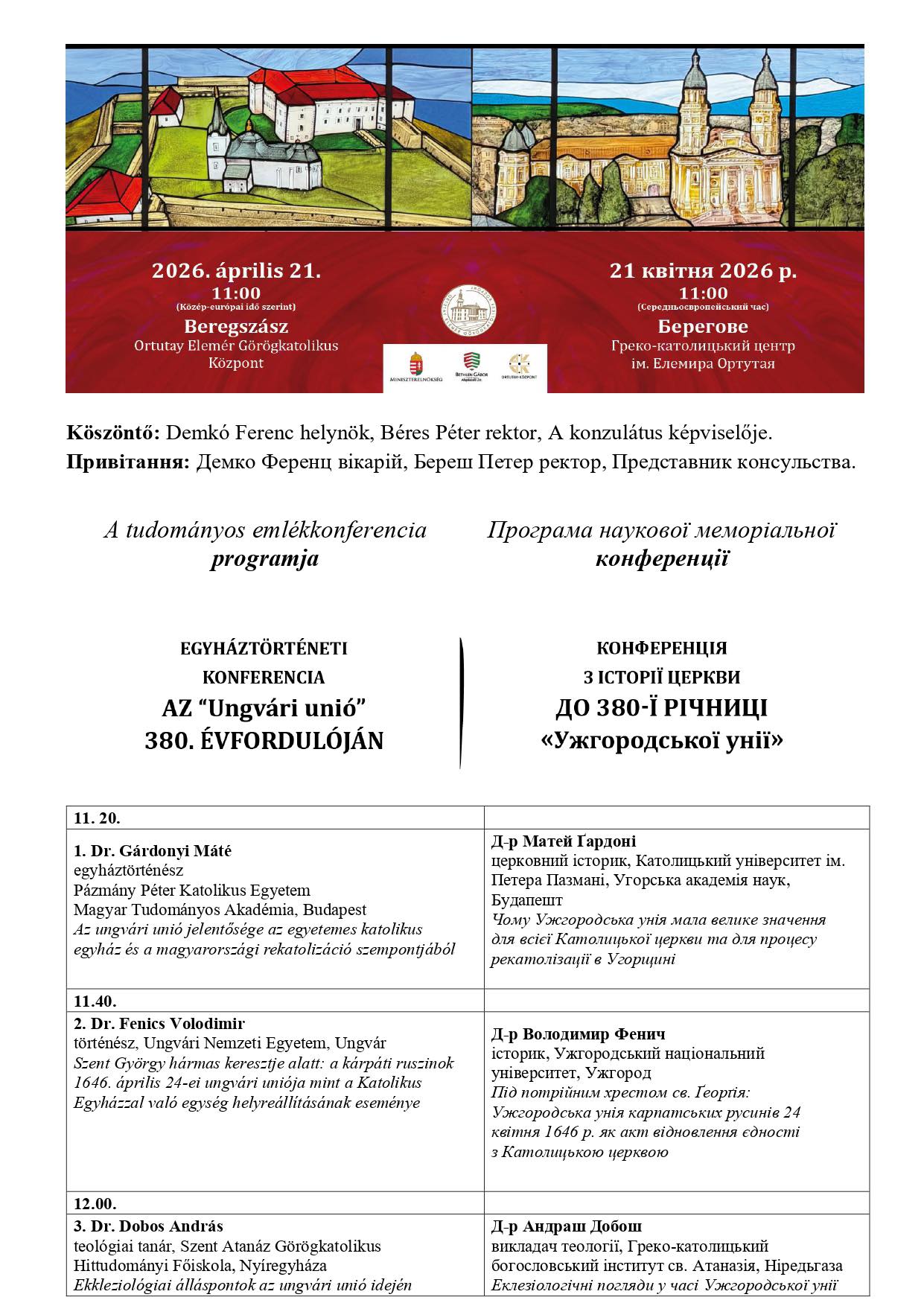 Košice, 24. apríl (TSKE) Pri príležitosti 380. výročia uzavretia Užhorodskej únie sa v utorok 21. apríla v priestoroch Gréckokatolíckeho centra Elemíra Ortutaya v ukrajinskom Berehove uskutočnila medzinárodná vedecká konferencia. Podujatie spojilo popredných odborníkov z akademický inštitúcii z Ukrajiny, Maďarska, Slovenska a Rumunska, aby spoločne reflektovali historický a duchovný odkaz udalosti, ktorá zásadne ovplyvnila náboženskú mapu strednej Európy.