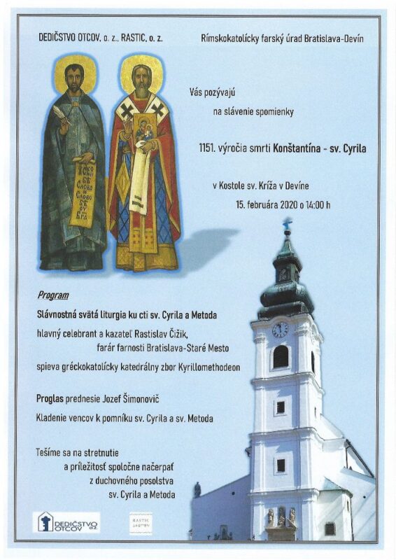 Pri príležitosti sviatku sv. Konštantína Cyrila (+ 869), ktorý sa slávi 14. februára sa bude konať v sobotu, 15. februára 2020 spomienková slávnosť na Devíne, v Kostole svätého Kríža.