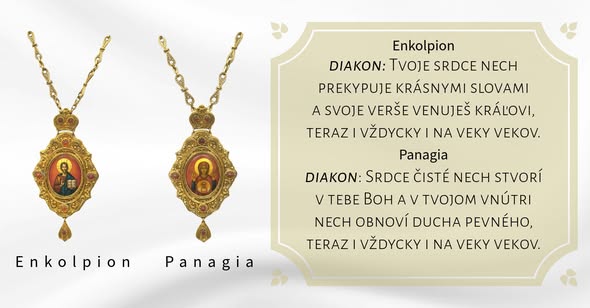 Na hruď si biskup následne kladie insígnie – panagiu a kríž. Panagia je drahocenný medailón s ikonou Presvätej Bohorodičky, ktorý je hlavným rozlišovacím prvkom biskupskej dôstojnosti. Biskup má mať s Bohorodičkou úprimný vzťah ako so svojou matkou, ktorú nám Kristus dal počas svojho ukrižovania. Tieto ozdoby sú nielen svedectvom o postavení v cirkevnej hierarchii, ale aj o povolaní niesť Kristov kríž pred tvárou sveta.