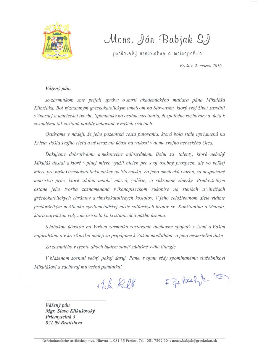 Vo štvrtok 10. marca 2016 doobeda sa v Katedrále Povýšenia Pánovho Kríža v Bratislave konali pohrebné obrady so zádušnou svätou liturgiou za zosnulého akademického umelca, rytiera Rádu sv. Silvestra, majstra Mikuláš Klimčáka.