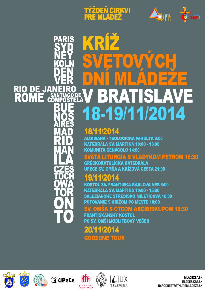Kríž. Tento kríž putuje krajinami a diecézami susediacimi s Poľskom v rámci prípravy na najbližšie celosvetové dni mládeže, ktoré sa budú konať v Krakove v roku 2016. Drevený symbol, ktorý už tri desaťročia križuje celým svetom, bude od 15. do 29. novembra 2014 putovať naprieč Slovenskom. Na Slovensko príde z Maďarska, a to 15. novembra do Košíc. Kríž na Slovensku zavíta do 19 miest, precestuje vyše 1 400 kilometrov.