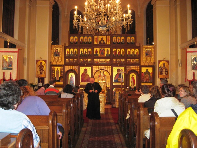 Vladimír Skyba sa snažil prítomným návštevníkom vysvetliť význam ikon, ktoré majú pôvod na kresťanskom Východe ako aj dejinné súvislosti ich vzniku. Poukázal aj na niektoré typické ikony ako Ježiš Kristus Pantokrator, Mandylion – Kristova tvár (nie rukou tvorený obraz), či ikona Deesis, na ktorej je zobrazený Ježiš Kristus kráľ spolu s dvoma veľkými orodovníkmi – Pannou Máriou a sv. Jánom Krstiteľom. Zvlášť sa venoval ikonám a ich usporiadaniu na ikonostase, ktorý v chráme oddeľuje svätyňu od lode, a ktorý je typickým liturgickým prvkom byzantských chrámov.