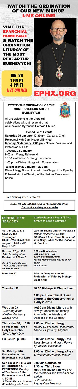 V utorok 28. januára 2025 v gréckokatolíckom chráme Zvestovania Pána v Anaheime na západnom pobreží USA, (v štáte California) o 13:00 miestneho času (t.j. 22.00 nášho času) sa bude konať biskupská chirotónia a intronizácia nového biskupa Eparchie Phoenix, Arthura Bubnevyča (Bubnevycha). Hlavným svätiteľom bude pittsburský arcibiskup metropolita vladyka William Ch. Skurla, spolusvätiteľmi budú: parmský eparcha vladyka Robert M. Pipta a passaický eparcha vladyka Kurt R. Burnette. Na slávnosti sa zúčastní aj prešovský arcibiskup metropolita, vladyka Jonáš Maxim.