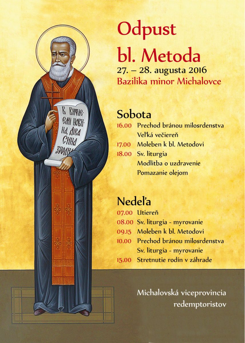 Michalovskí redemptoristi pozývajú na odpustovú slávnosť k blahoslavenému Metodovi Trčkovi, ktorá sa bude konať najbližší víkend, 27.-28. augusta 2016 v Bazilike minor Zoslania Svätého Ducha v Michalovciach.