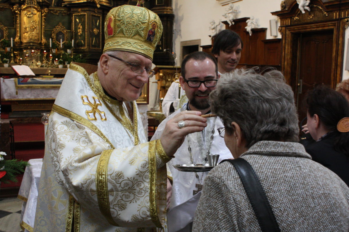 Chvíle pred záverečným požehnaním po speve paschálneho tropára cirkevnoslovansky, slovensky i grécky patrili slovám vďaky. V prvom rade Bohu, ktorý koná veľké veci v živote každého z nás a osobitne i s týmto slovenským farským spoločenstvom. I samotné spoločenstvo oslavuje – a to 5 rokov od svojho založenia. Poďakovanie patrilo i pastierovi – vladykovi Ladislavovi, ktorý sa tohto roku dožil jubilea 70 rokov a súčasne si pripomína 15. výročie svojej biskupskej vysviacky. Od farníkov a miestneho duchovného dostal viacero darčekov, okrem iného aj slovenský časoslov. V duchu hesla „I na všetkých i na všetko“ sa miestny farár poďakoval všetkým, ktorí prispeli k tomu, že farnosť rastie, rozvíja sa a žije. Vyjadril vďaku brnenskému rímskokatolíckemu biskupovi Mons. Vojtechovi Cirkle, bývalému rektorovi chrámu sv. Márie Magdalény Mons. Františkovi Koutnemu, ako aj súčasnému – Mons. Jaroslavovi Čuprovi, spolusláviacim kňazom, miništrantovi Slavovi Lacovi z Bardejova, zboru, kantorkám i farníkom, ktorí väčšou, či menšou mierou prispeli k budovaniu tejto farnosti. Poďakovaniu sa dostalo, hoci len na diaľku aj gréckokatolíckym biskupom zo Slovenska, vladykovi Petrovi Rusnákovi a vladykovi Milanovi Lachovi, ktorí pomáhali v začiatkoch farnosti nielen duchovne, ale aj materiálne. Ako pripomienku cirkvi trpiacej dostalo sa poďakovania aj pánovi Konštantínovi Balážovi, ktorý ako syn gréckokatolíckeho kňaza Eliáša Baláža zakúsil čo to znamená prenasledovanie pre vieru.