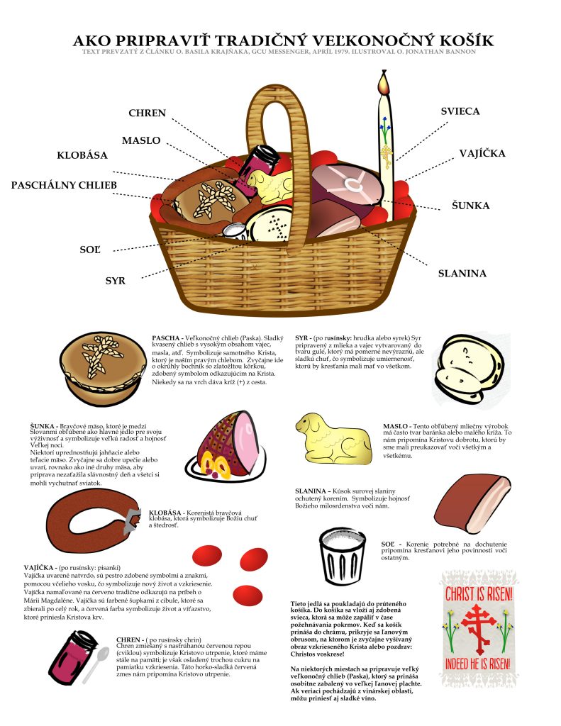 Nasledujúci schematický obrázok bol vytvorený s cieľom ukázať jednotlivé zložky tradičného paschálneho košíka. Košíky s paschálnymi pokrmami sa prinášajú na utiereň Vzkriesenia (v noci alebo