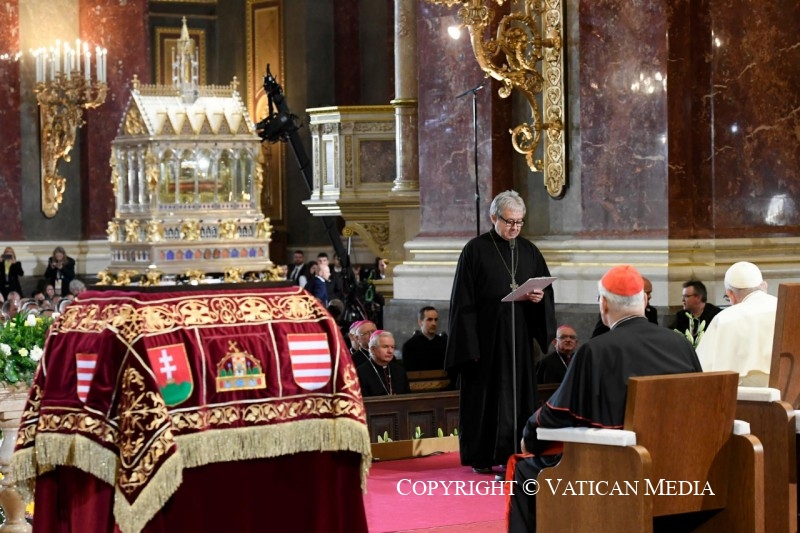 O 17.00 h sa stretol s biskupmi, kňazmi, diakonmi a rehoľníkmi a pastoračnými pracovníkmi v Konkatedrále svätého Štefana. Po pozdravnom príhovore predsedu Konferencie biskupov Maďarska J.E. Mons. Andrása Veresa, biskupa diecézy Győr, niekoľko osôb prednieslo svoje svedectvá o svojom povolaní: rímskokatolícku kňaz, gréckokatolícky kňaz – Kondás Sándor, rehoľná sestra a katechétka. Potom predniesol svoj príhovor pápež. Na záver stretnutia Svätý Otec vyšiel na námestie pred baziliku, aby sa stretol s veriacimi.