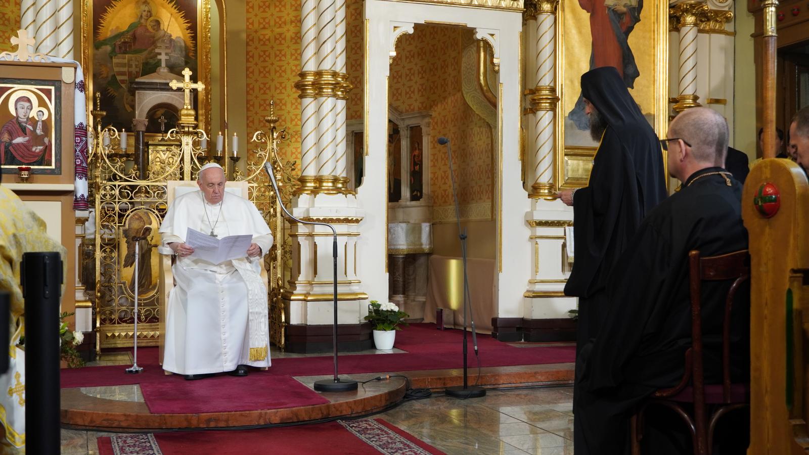 K tejto modlitbe sa pripojil aj Svätý Otec, ktorý si sadol na sedes umiestnený pred cárskymi dverami do svätyne. Svätého Otca pozdravil biskup Szilárd Keresztes, biskup Atanáz a biskup Ábel a metropolita Filip, ktorý predniesol svoj pozdravný príhovor, v ktorom vyjadril radosť z toho, že prítomnosť pápeža potvrdzuje, že gréckokatolíci sú rovnocennými členmi Katolíckej cirkvi.
