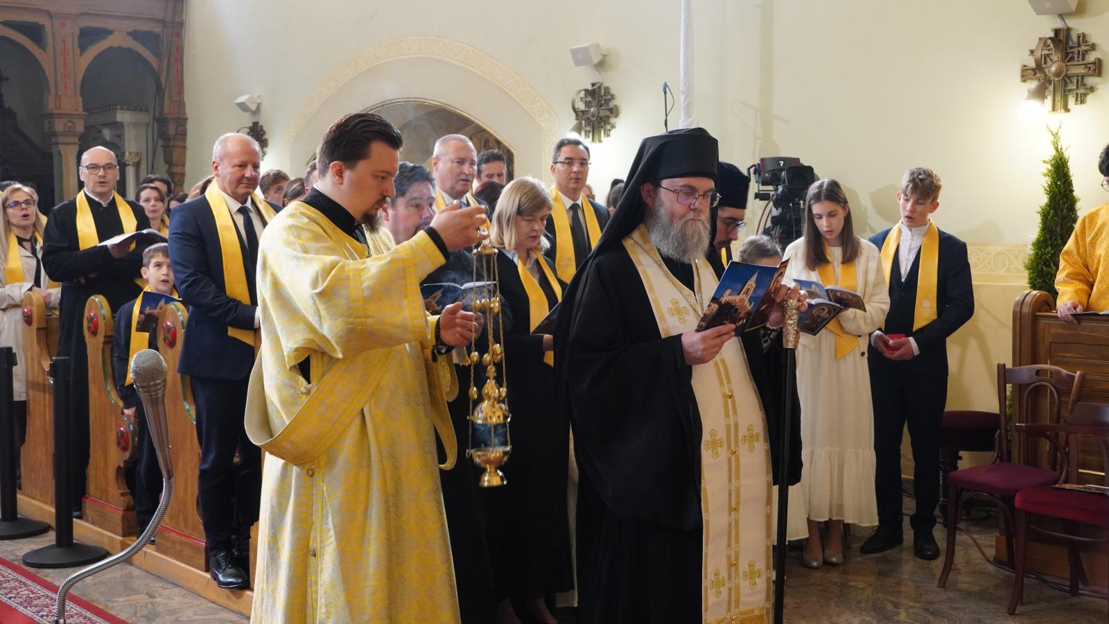 Pred chrámom čakali na hlavu Katolíckej cirkvi bohoslovci, ktorých privítal metropolita Filip a farár Jaczkó Sándor. V kostole biskup Atanáz viedol modlitbu Akatistu, ktorú spieval zbor pod vedením laureáta ceny F. Liszta, dirigent Tamása Bubnó.