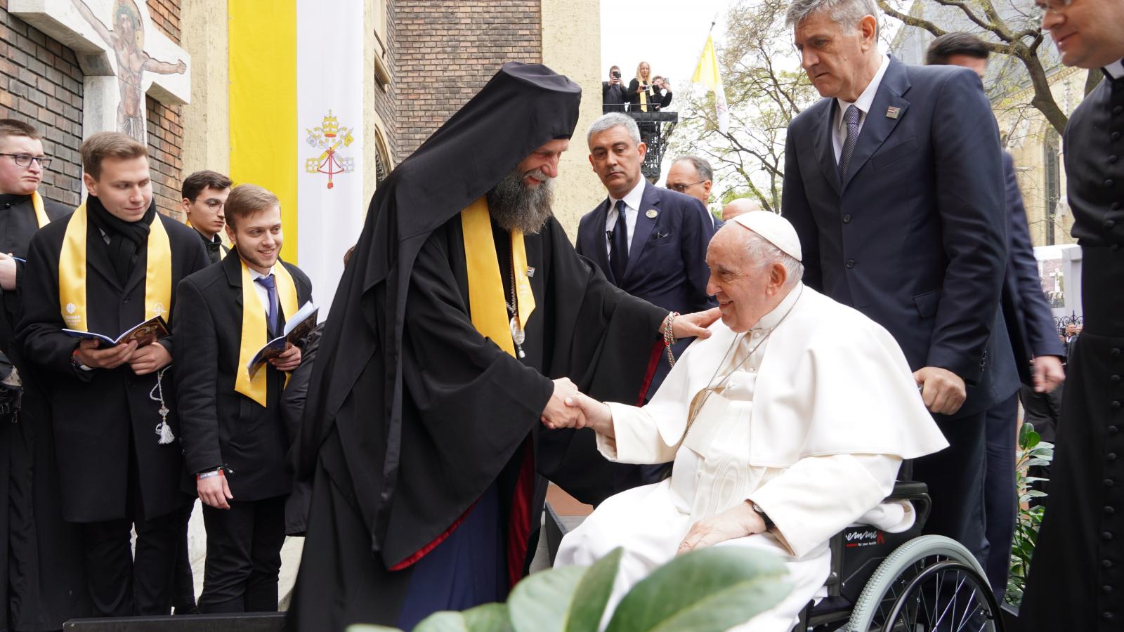 Budapešť (29. apríla) – Druhýkrát od návštevy pápeža Jána Pavla II. v Máriapóči v roku 1991 navštívil nástupca svätého Petra maďarských gréckokatolíkov: v sobotu 29. apríla 2023 sa pápež František modlil s gréckokatolíckymi veriacimi v chráme Ochrany Matky Božej na Ružovom námestí v Budapešti.