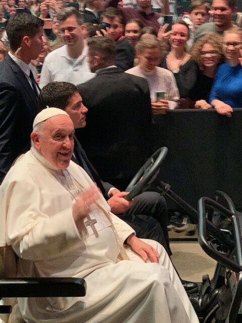 Po krátkej prezentácii ľudového tanca svedčili niekoľkí mladí ľudia o svojej viere pred pápežom. Všetky ich svedectvá nadšene privítalo 11 000 účastníkov, ktorí zaplnili arénu, pričom ich slová niekoľkokrát prerušili potleskom.