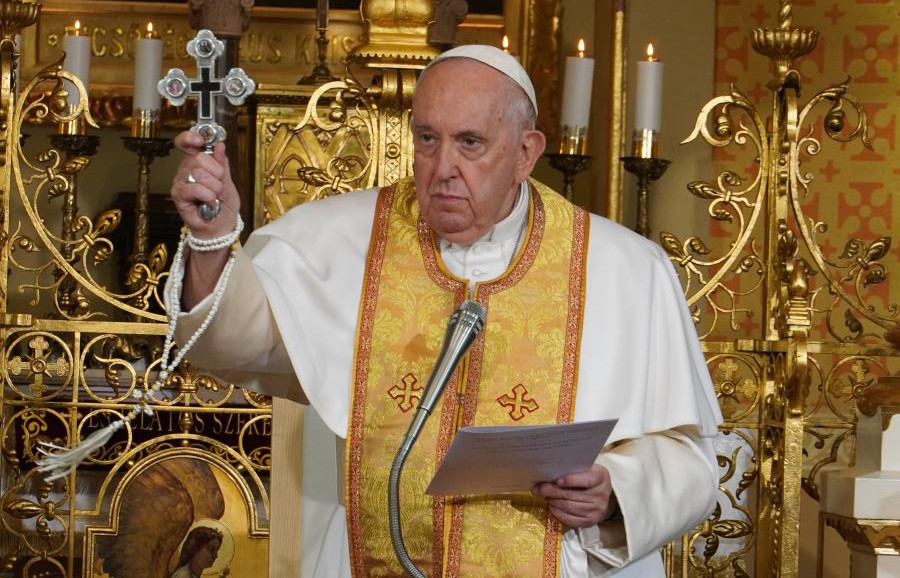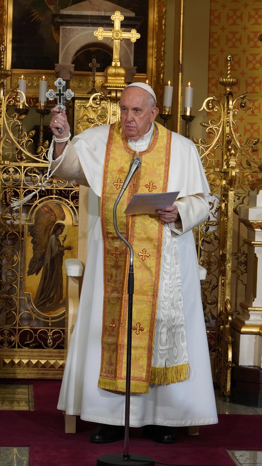 Budapešť (29. apríla 2023) – Na záver stretnutia s chudobnými a utečencami v Kostole svätej Alžbety Uhorskej v Budapešti (sobota, 29. apríla 2023) sa Svätý Otec František stretol s gréckokatolíckou komunitou v Chráme Ochrany Matky Božej.