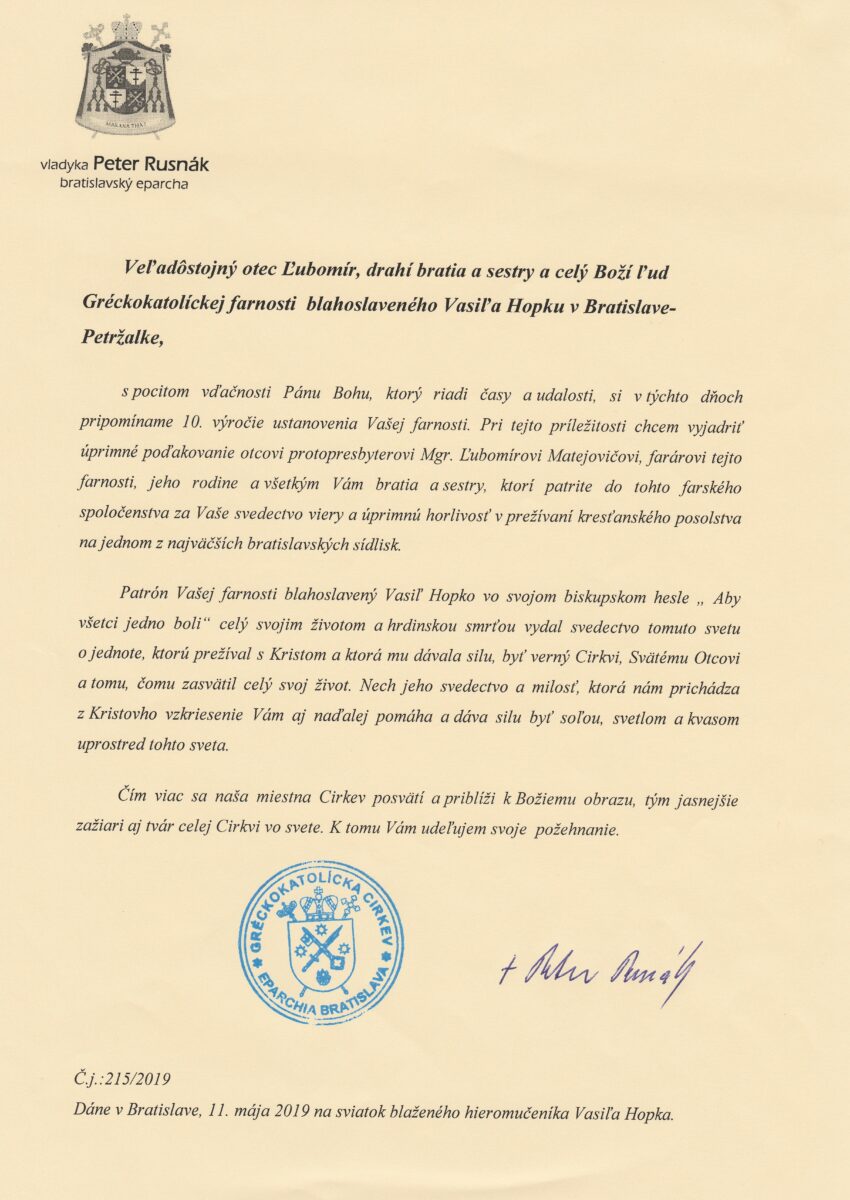 V nedeľu 12. mája 2019 sa v Kostole Svätej rodiny v bratislavskej Petržalke konala odpustová slávnosť pri príležitosti sviatku patróna farnosti, bl. Vasiľa Hopku. Tohtoročný odpust bol o to slávnostnejší, že miestne farské spoločenstvo si zároveň pripomenulo desiate výročie svojej existencie. Od zriadenia farnosti stojí na jej čele gréckokatolícky kňaz, protopresbyter o. Ľubomír Matejovič. Svojím pastoračným úsilím, ľudskosťou a citlivým prístupom neustále prispieva spolu so svojou manželkou k rozvíjaniu a prehlbovaniu duchovného života farnosti.