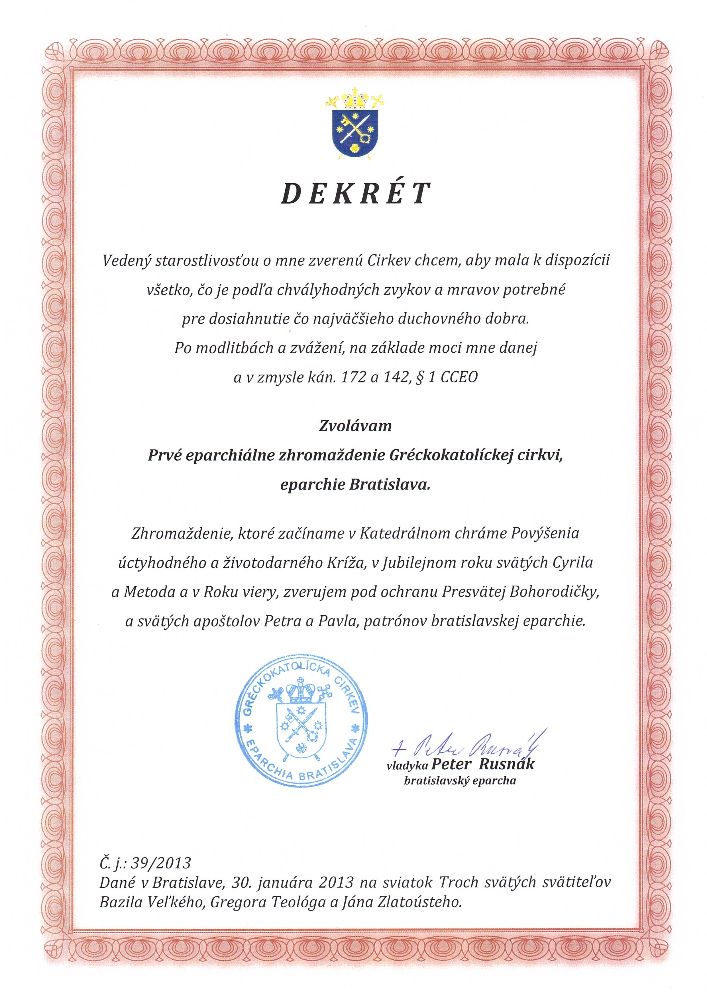 Na záver sv. liturgie prečítal vladyka Peter dekrét o otvorení Eparchiálneho zhromaždenia, ktorého cieľom je analyzovať „problémy, ktorými veriaci našich farností žijú a aj smery, alebo nejaké vízie, kam by sa mala naša cirkev do budúcnosti uberať a čo by mali byť jej priority a ciele“.