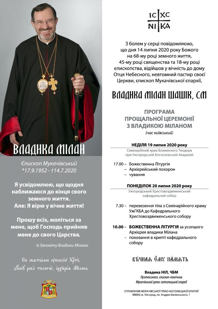 V pondelok 20. júla bude o 8.00 hod. (7.00 SELČ) rakva s telom prenesená do Katedrály Povýšenia sv. Kríža v Užhorode, kde o 10.00 hod. (9.00 SELČ) bude slávená archijerejská svätá liturgia, po ktorej budú telesné ostatky vladyku Milana Šášika uložené do katedrálnej krypty. Priamy online prenos z katedrály bude možné sledovať na tomto linku (TV LOGOS).