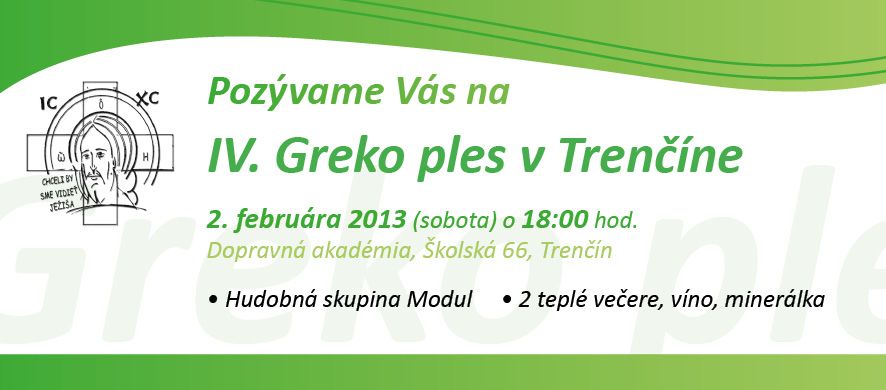 gk ples web - pozvankaGréckokatolícka farnosť Trenčín pozýva na 4. ročník farského GREKO plesu, ktorý sa uskutoční v sobotu 2. februára 2013 o 18:00 hod. v Dopravnej akadémii v Trenčíne. Lístok na ples je v cene 20,- Eur a možno si ho kúpiť na farskom úrade. Na plese nebude chýbať tombola, pričom výťažok z nej bude použitý na pripravovanú výstavbu novej cerkvi v Trenčíne. O spev a dobrú náladu sa postará hudobná skupina MODUL z Bardejova.
