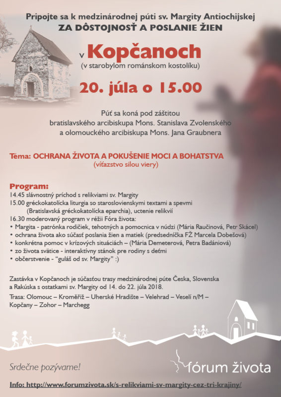 Bratislavská eparchia a Fórum života pozývajú na gréckokatolícku sv. liturgiu do starobylého románskeho Kostolíka sv. Margity Antiochijskej v Kopčanoch (9.-10. stor.) v rámci medzinárodnej púte relikvií sv. Margity Antiochijskej, ktorá sa bude sláviť v piatok, 20. júla o 15.00 hod. Pred liturgiou o 14.45 hod, bude tiež slávnostné uvítanie relikvií.