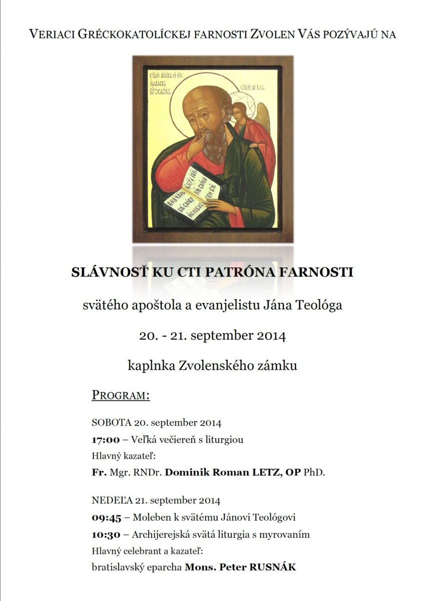 Gréckokatolícka farnosť Zvolen pozýva na odpustovú slávnosť ku cti patróna farnosti svätého apoštola a evanjelistu Jána Teológa. Odpustová slávnosť sa bude konať 20. – 21. septembra 2014 v kaplnke Zvolenského zámku.
