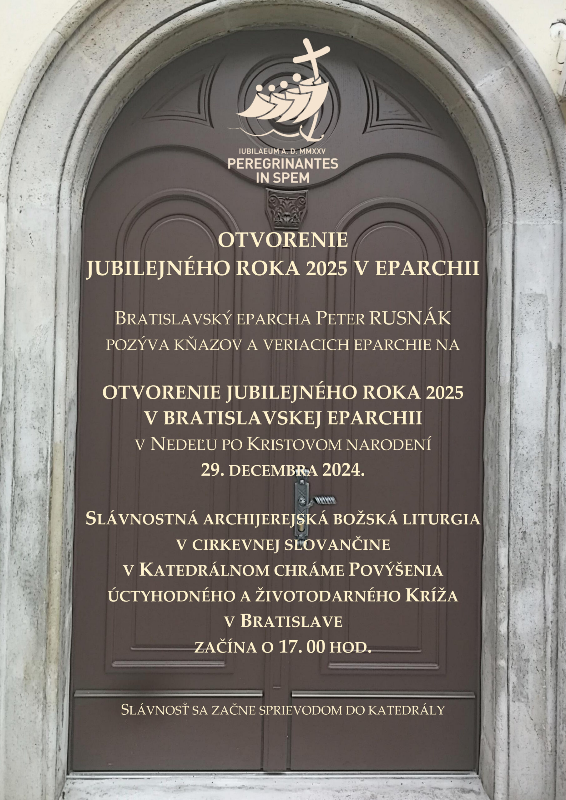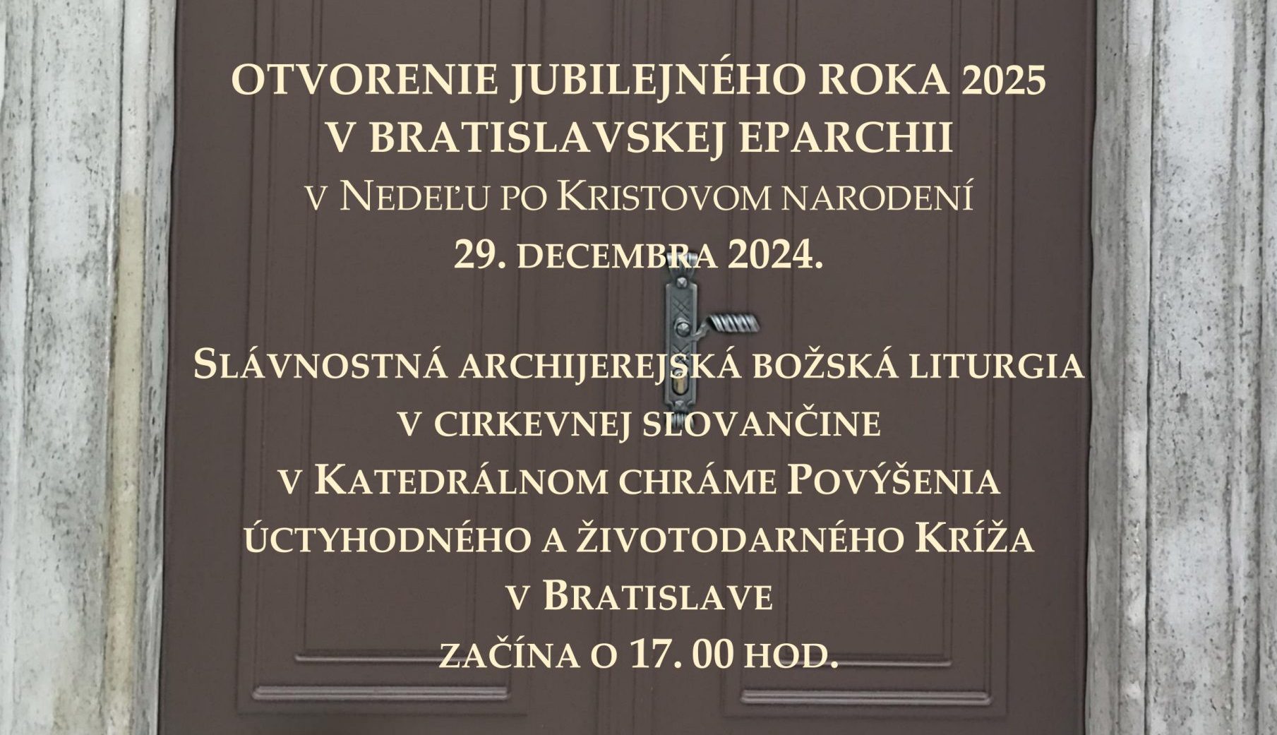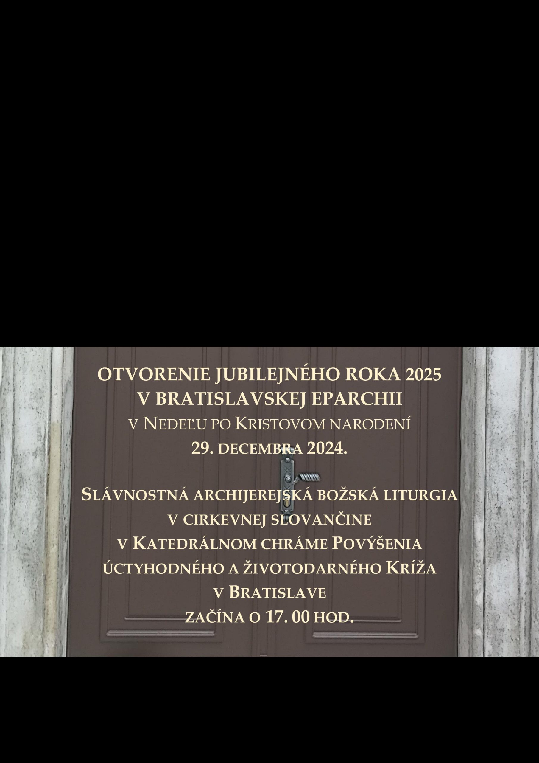 Otvorenie jubilejného roka v našej eparchii, tak ako aj v ostatných diecézach a eparchiách po celom svete sa uskutoční v Nedeľu po Kristovom narodení 29. decembra, slávením archijerejskej svätej liturgie o 17. 00 hod. v katedrálnom chráme Povýšenia Pánovho Kríža v Bratislave. (liturgický jazyk bude cirkevnoslovansky, liturgická farba svetlá).