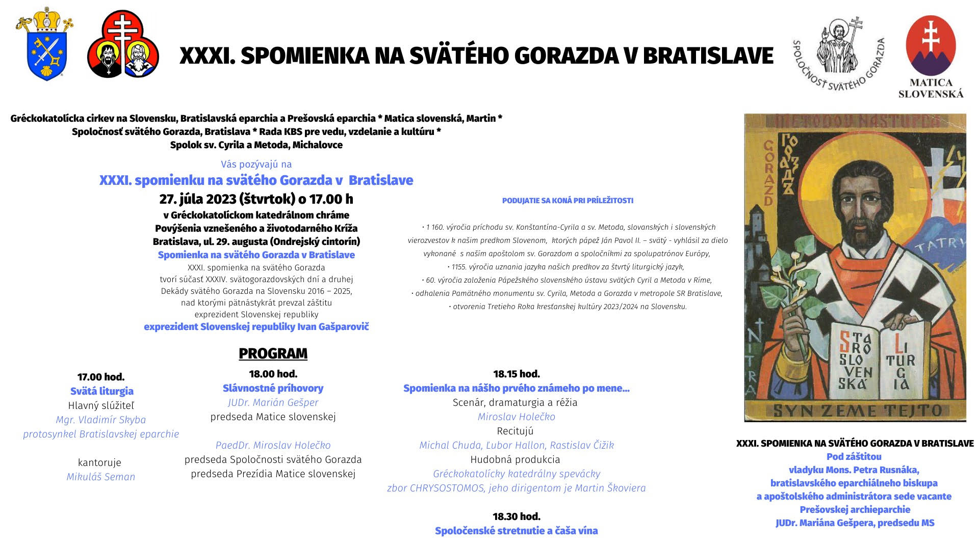 Vo štvrtok 27. júla 2023, na sviatok Svätých sedmopočetníkov (sv. Cyrila, Metoda, Gorazda, Klimenta, Nauma, Sávu a Angelára) sa v Katedrálnom chráme Povýšenia svätého Kríža uskutoční podujatie – XXXI. Spomienka na svätého Gorazda v Bratislave. Organizátormi podujatia sú: Gréckokatolícka cirkev – Bratislavská eparchia; Matica slovenská, Martin; Spoločnosť svätého Gorazda; Rada KBS pre vedu, vzdelanie a kultúru; Spolok sv. Cyrila a Metoda, Michalovce.
