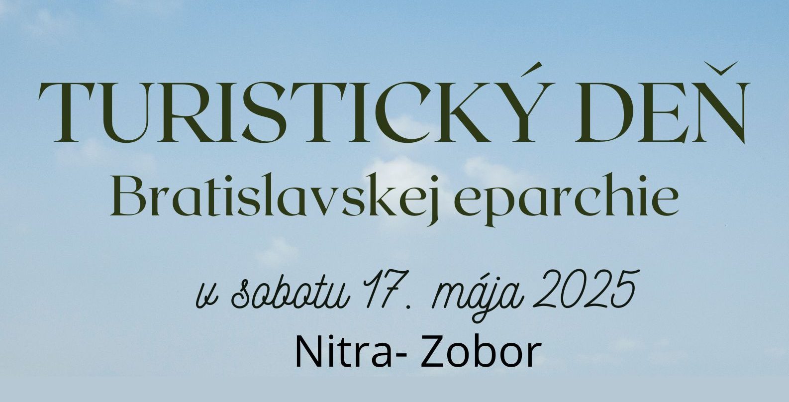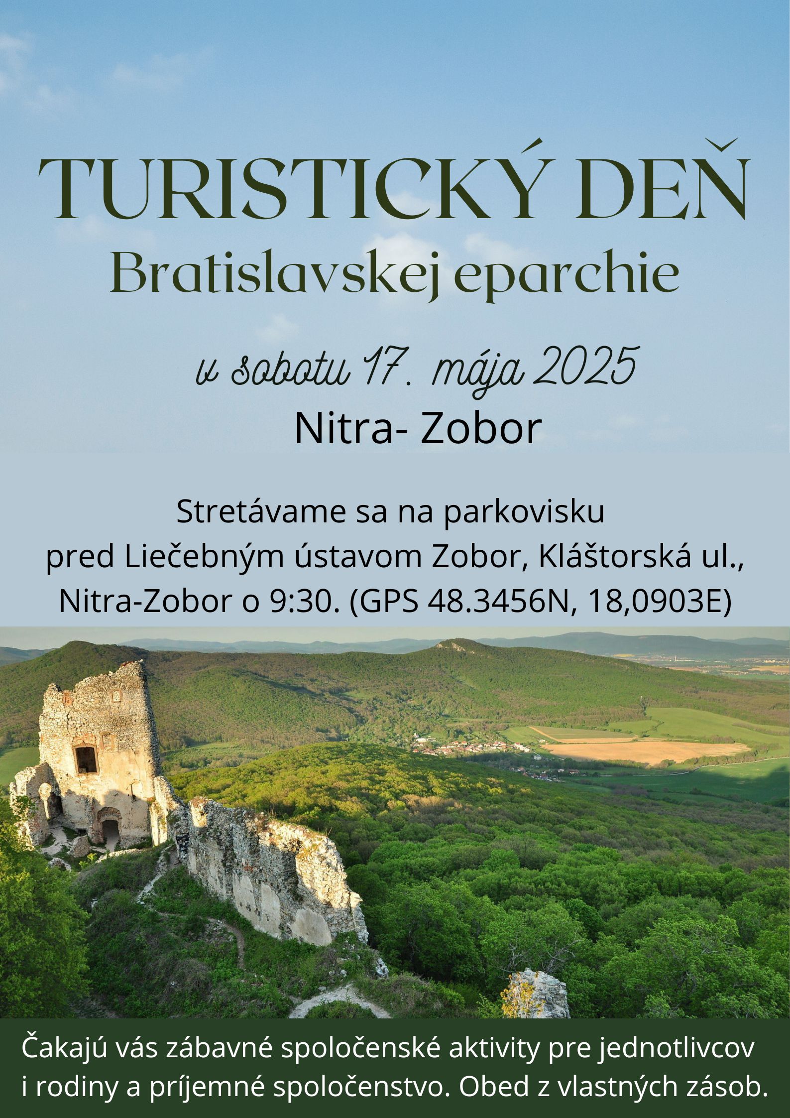 V sobotu 17. mája 2025 pozývame na Turistický deň Bratislavskej eparchie. Stretávame sa na parkovisku pred Liečebným ústavom Zobor, Kláštorská ul., Nitra-Zobor o 9:30 hod. a odtiaľ pôjdeme na ZOBOR. Čakajú vás zábavné spoločenské aktivity pre jednotlivcov i rodiny a príjemné spoločenstvo.