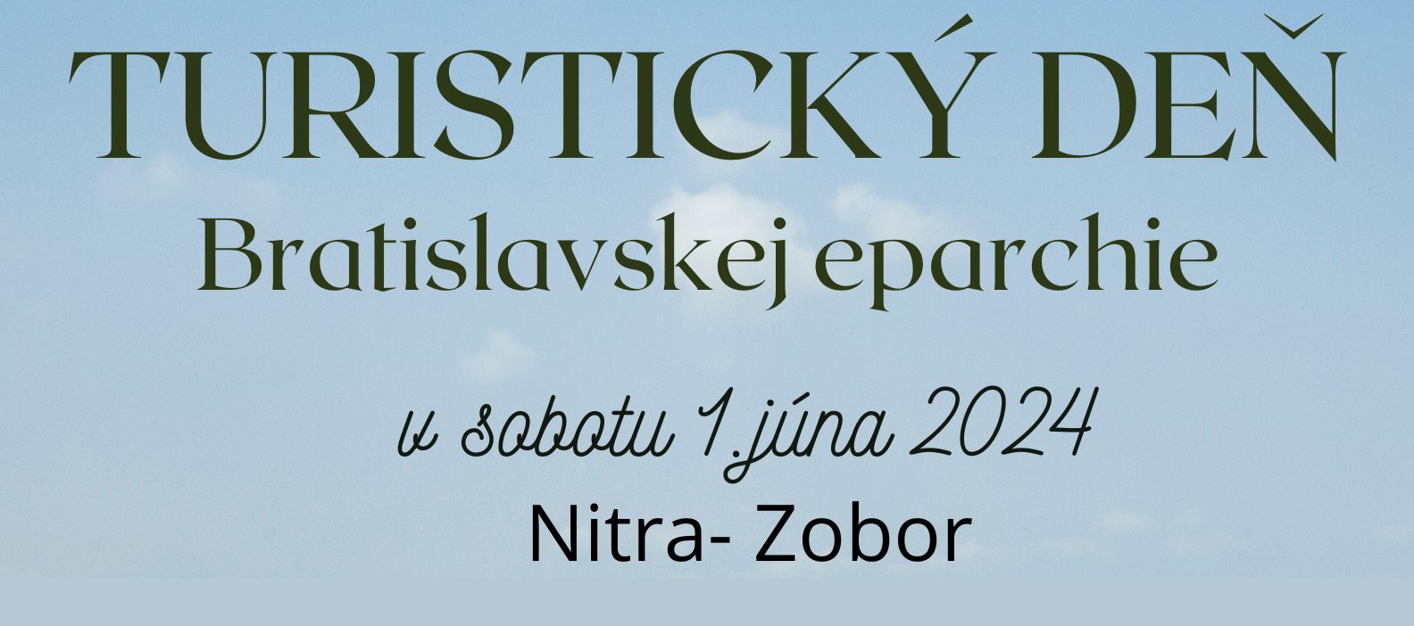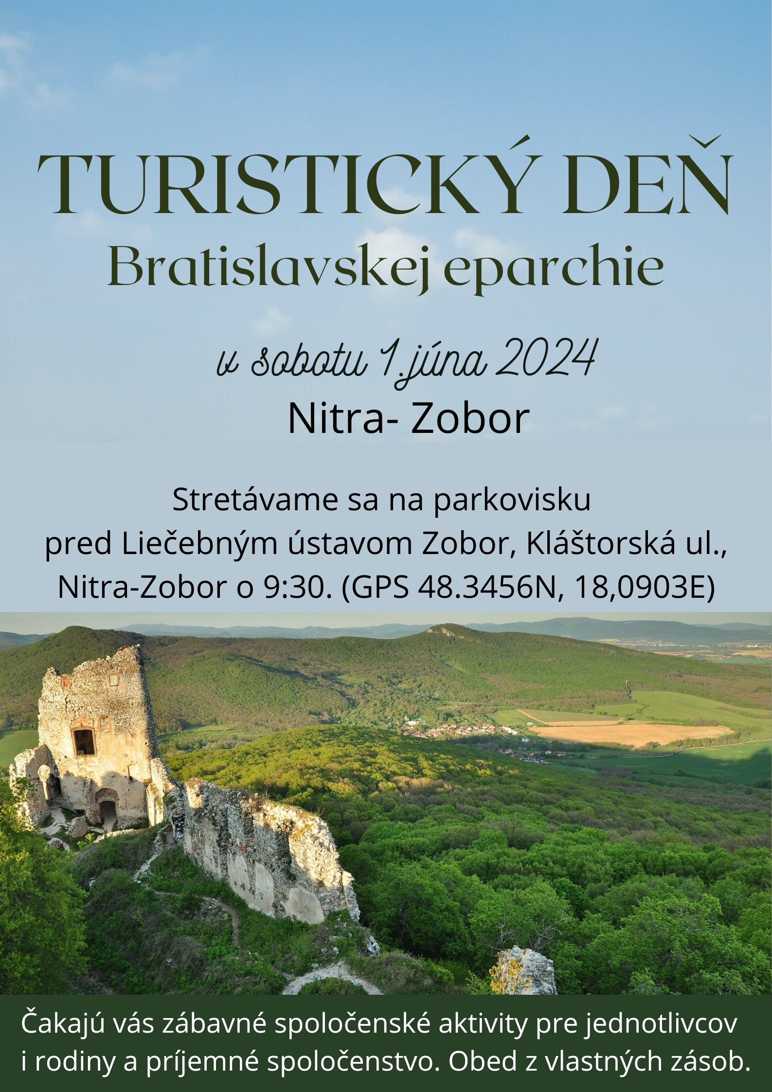 V sobotu 1. júna 2024 sa uskutoční Turistický deň Bratislavskej eparchie. Stretávame sa na parkovisku pred Liečebným ústavom Zobor, Kláštorská ul., Nitra-Zobor o 9:30 hod. a odtiaľ pôjdeme na ZOBOR. Čakajú vás zábavné spoločenské aktivity pre jednotlivcov i rodiny a príjemné spoločenstvo. Obed z vlastných zásob. (Plánovaná je nenáročná trasa, ktorá má ca. 6 km a prevýšenie 350m.)