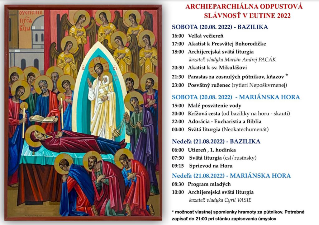 - Archijerejskú svätú liturgiu v sobotu 20. augusta o 18.00 hzBaziliky Zosnutia Presvätej Bohorodičky, ktorú bude v priamom rozhlasovom prenose vysielať Rádio Lumen.
