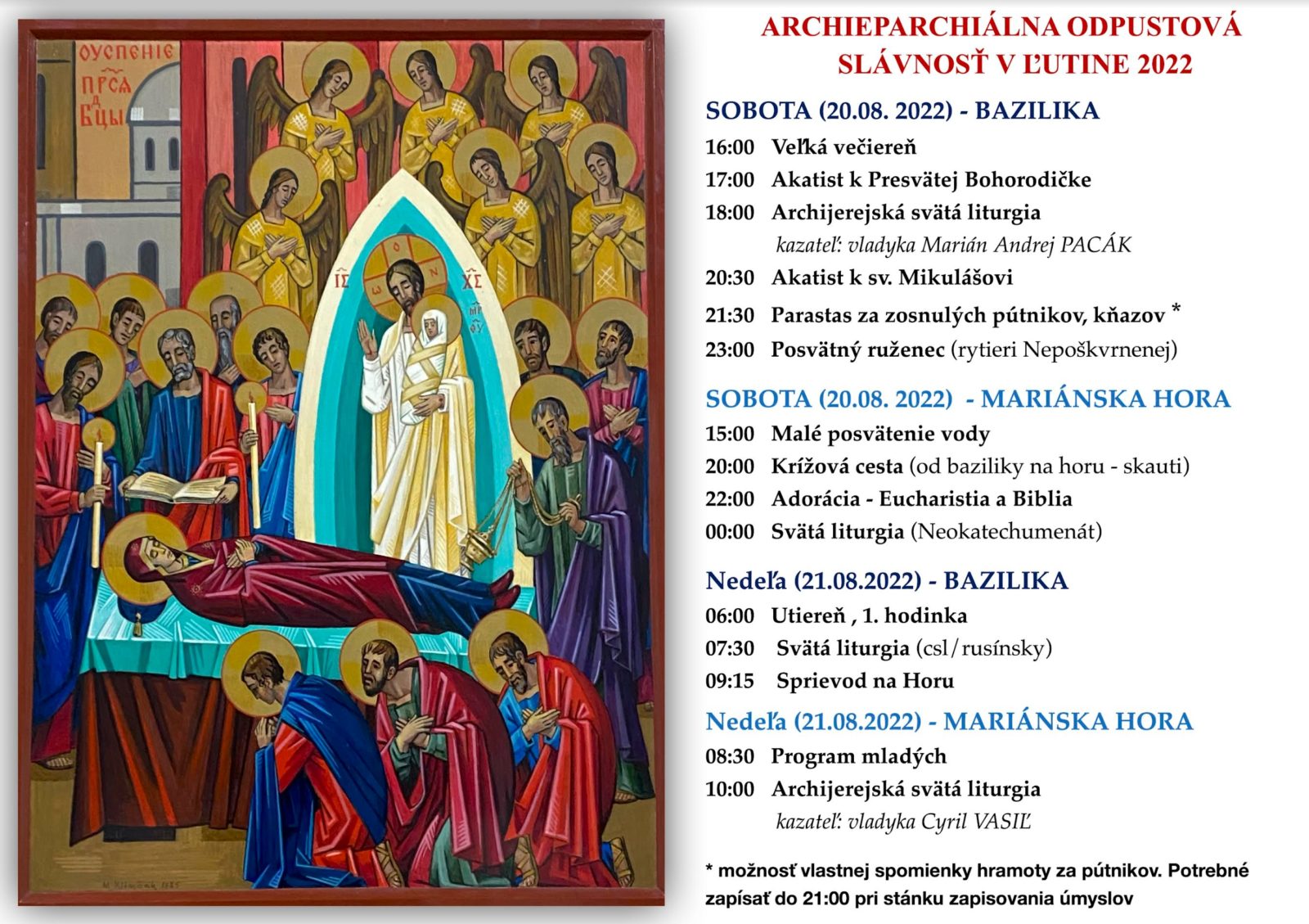 Prešovská archieparchia pozýva na odpustovú slávnosť do Ľutiny – tradičný uspenský odpust, ktorý sa koná 20.-21. augusta 2022 pri príležitosti sviatku Zosnutia presvätej Bohorodičky. Program bude tradične prebiehať v bazilike ako aj na mariánskej hore. Bližšie informácie sú na plagáte.
