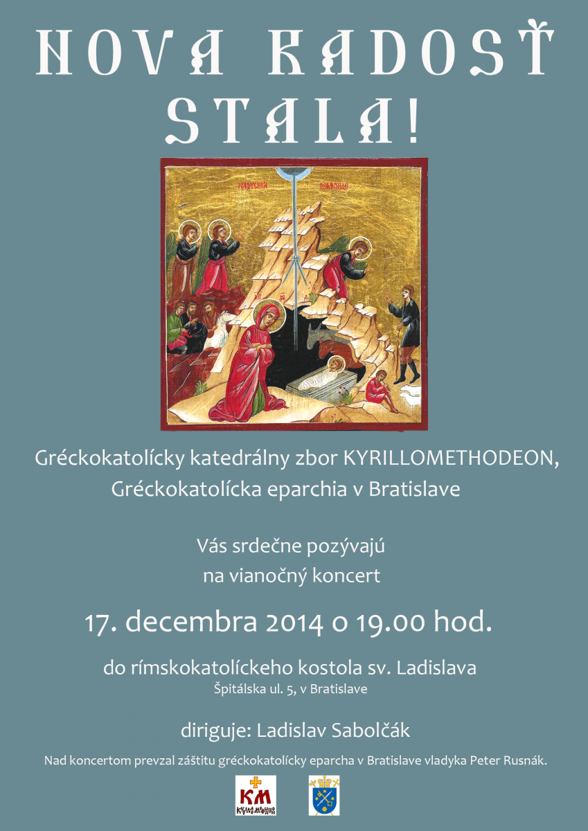 Gréckokatolícky katedrálny zbor Kyrillomethodeon a Bratislavská eparchia vás pozývajú na tradičný vianočný koncert, ktorý sa bude konať v stredu 17. decembra 2014 o 19.00 hod. v Kostole sv. Ladislava (na ul Špitálska č. 5, oproti OD TESCO). Počas koncertu pod názvom „Nova radosť stala” odznejú okrem cirkevnoslovanských liturgických spevov ako napr. Tebe pojem (bulharský nápev), Dostojno jesť (D. Bortňanskyj) tradičné rusínske a ukrajinské koledy, ako napr. V Viflejemi novina, Tajna nam sja javila, Ščedryk, či Nova radosť stala. Diriguje Ladislav Sabolčák. Záštitu na koncertom prevzal vladyka Peter Rusnák, bratislavský eparcha.