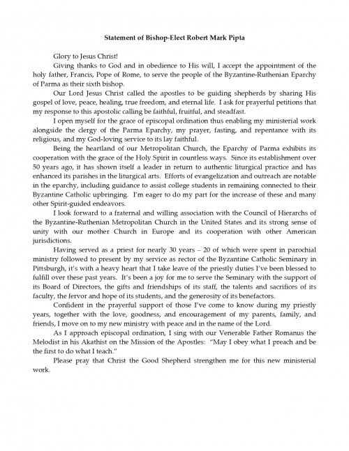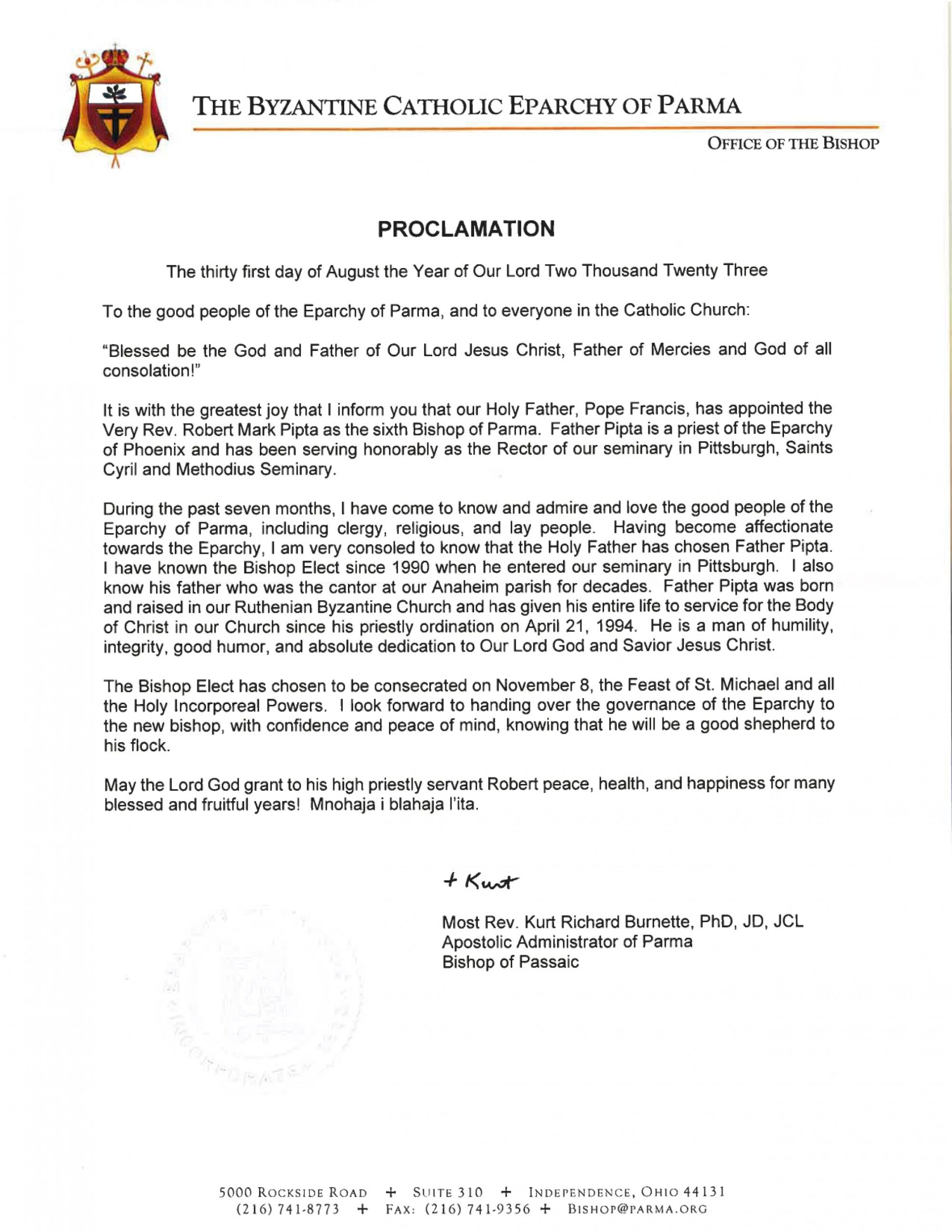 USA, 31. august (TK KBS) Na pravé poludnie 31. augusta bolo vo Vatikáne oznámené menovanie šiesteho sídelného biskupa pre ruténsku eparchiu Parma v USA. Novým vladykom sa stal o. Robert Mark Pipta, doterajší rektor seminára sv. Cyrila a Metoda v Pittsburghu.