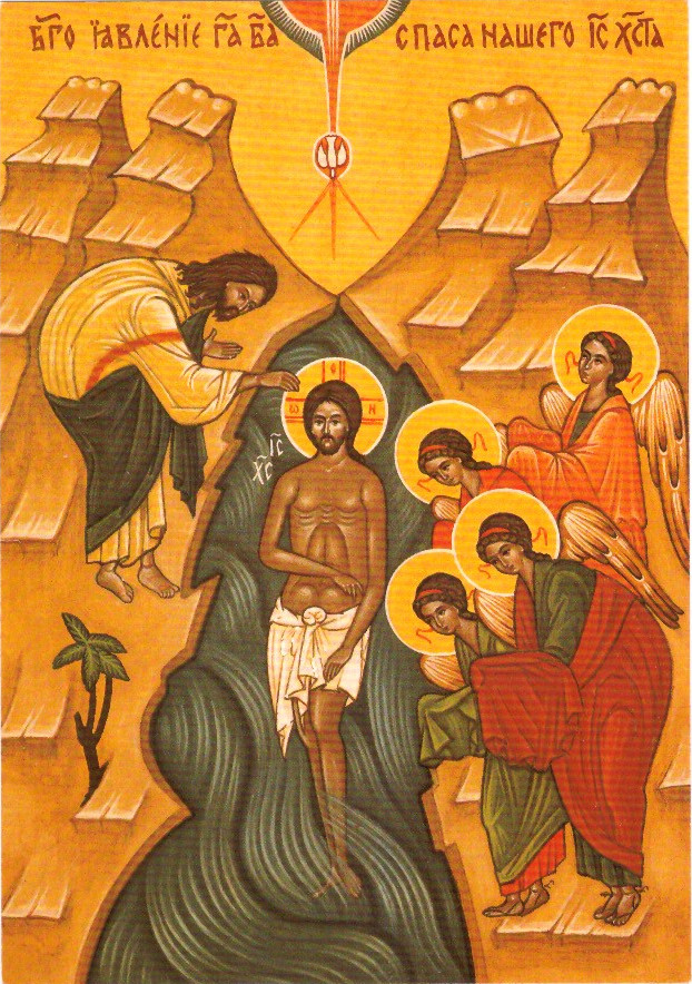„Vo Jordaňi kreščajuščusja Tebi, Hospodi, trojčeskoje javisja poklonenije: roditelev bo hlas sviditeľstvovaše Tebi, vozľublennaho Ťa Syna imenuja, i Duch, v viďi holubiňi, izvistvovaše slovese utverždenije. Javlejsja, Christe Bože, i mir prosviščej, slava Tebi.“