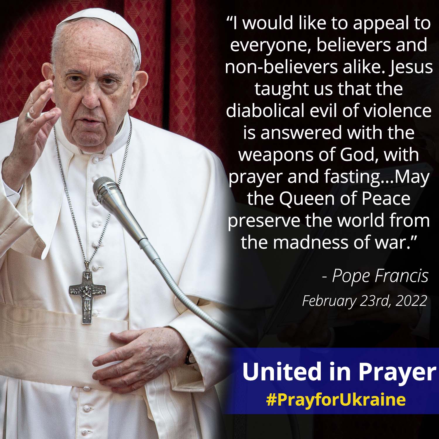„Ježiš nás učil, že na diabolskú nezmyselnosť násilia sa odpovedá Božími zbraňami, modlitbou a pôstom. Nech Kráľovná mieru ochráni svet pred vojnovým šialenstvom.“
