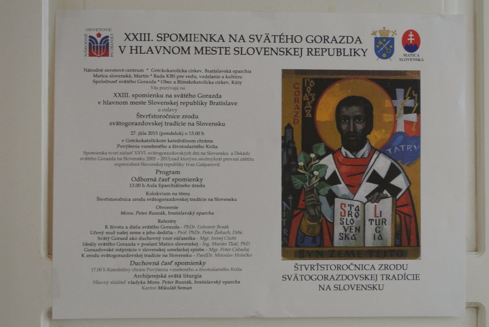 Bratislava (27. júla) – V Bratislavskej gréckokatolíckej Katedrále Povýšenia vznešeného a životodarného Kríža a na Eparchiálnom úrade sa v pondelok 27. júla 2015 uskutočnili oslavy štvrťstoročnice zrodu svätogorazdovskej tradície na Slovensku spojené s XXIII. spomienkou na svätého Gorazda v hlavnom meste Slovenskej republiky Bratislave.